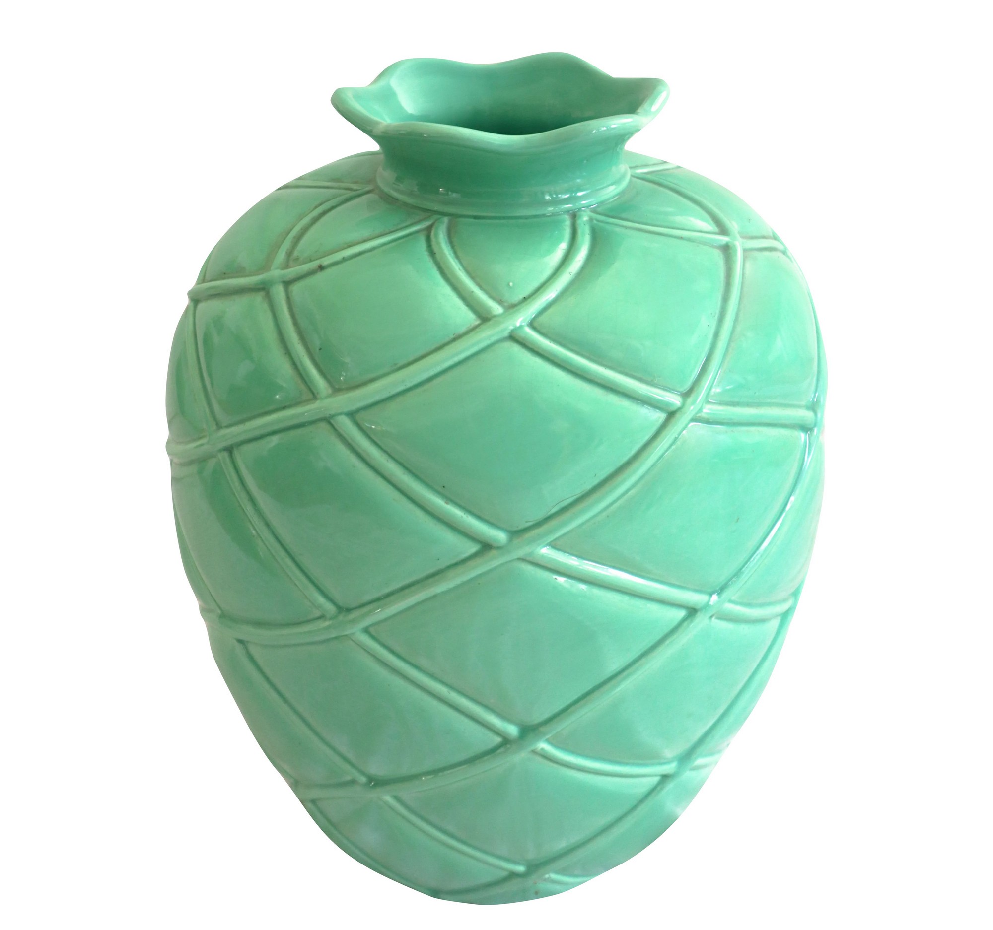 Vaso in maiolica verde di forma globulare h cm 45, diametro cm 30 Produzione italiana nello stile di G. Gariboldi. Vaso nei toni del verde acqua. Riportante decoro a sbalzo raffigurante losanghe lungo la superficie. Collo estroflesso a guisa di fiore. Presente piccola sbeccatura