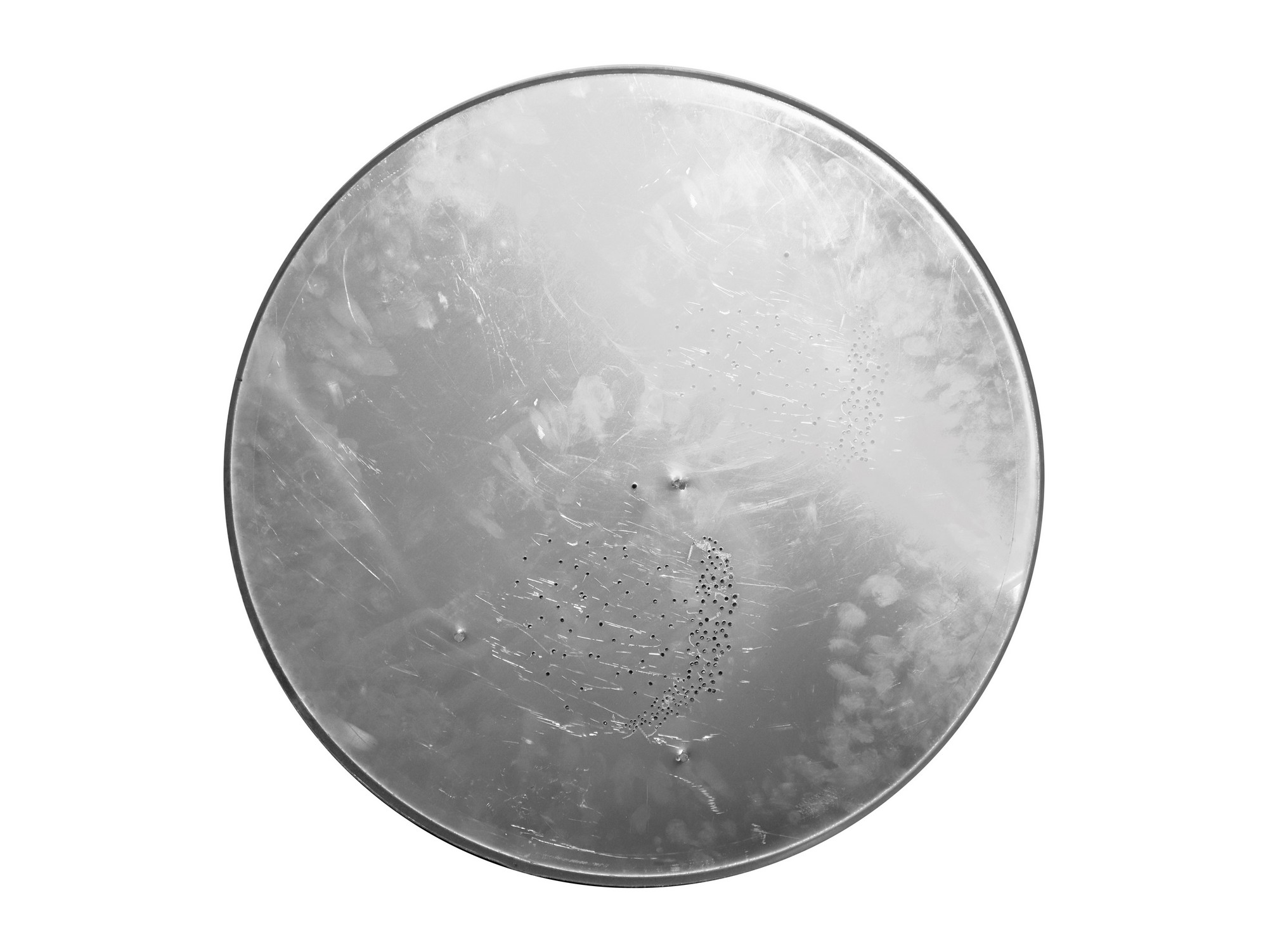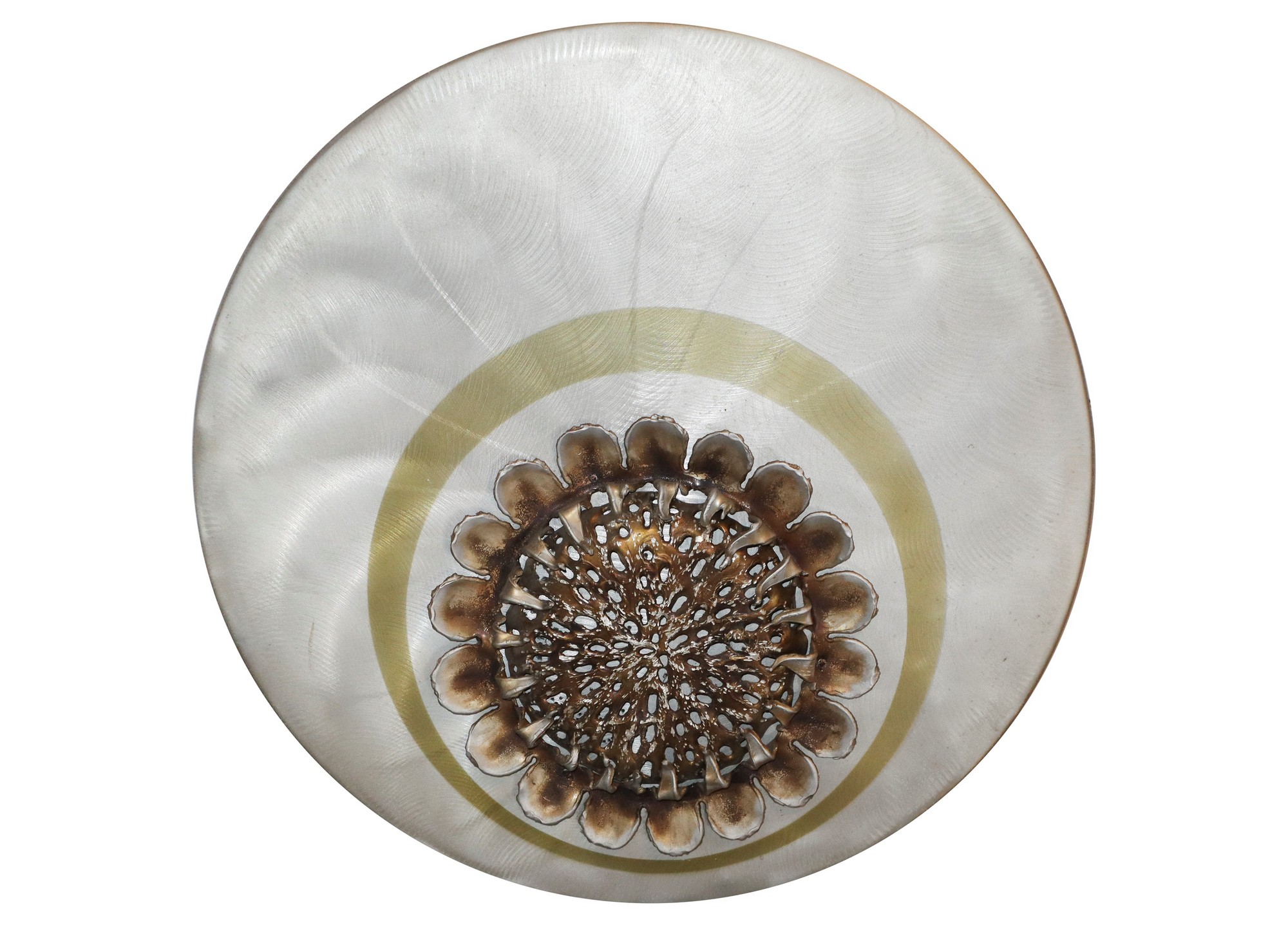 Pannello decorativo in metallo satinato, 60's diametro cm 60 Nello stile di studio Davico. Di forma circolare con applicato elemento fitomorfo in metallo stilizzato e brunito. Segni di uso.