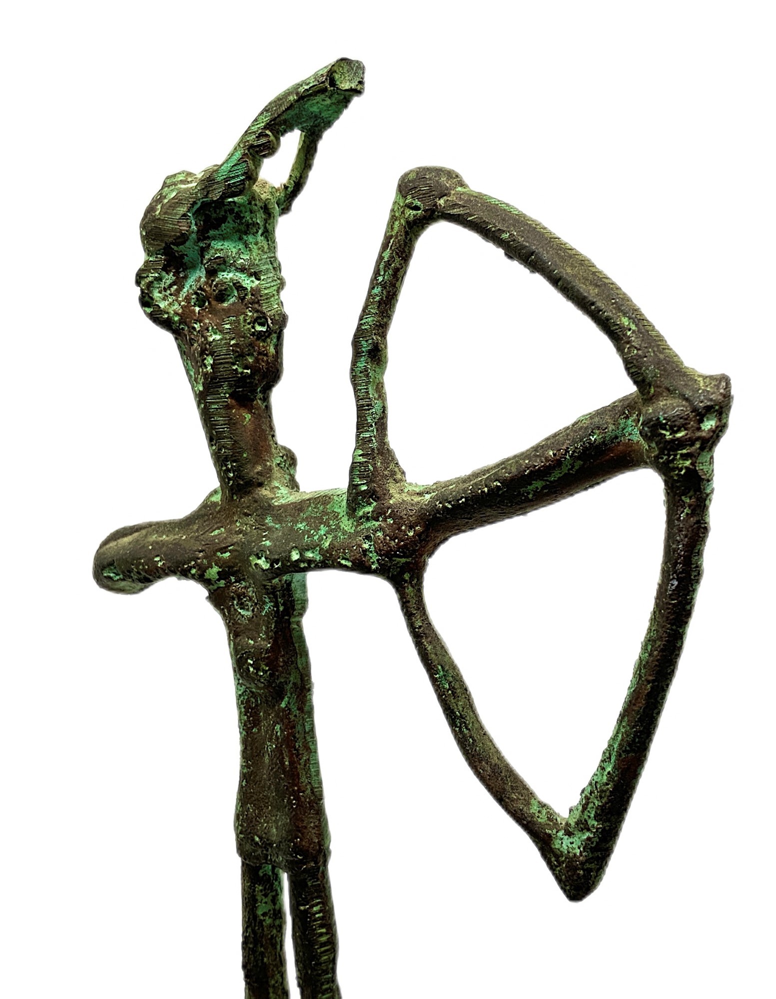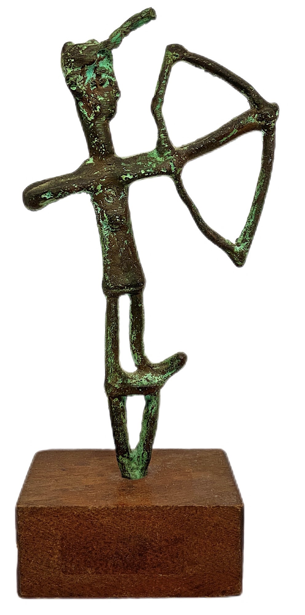 Scultura in bronzo battuto raffigurante guerriero con arco.