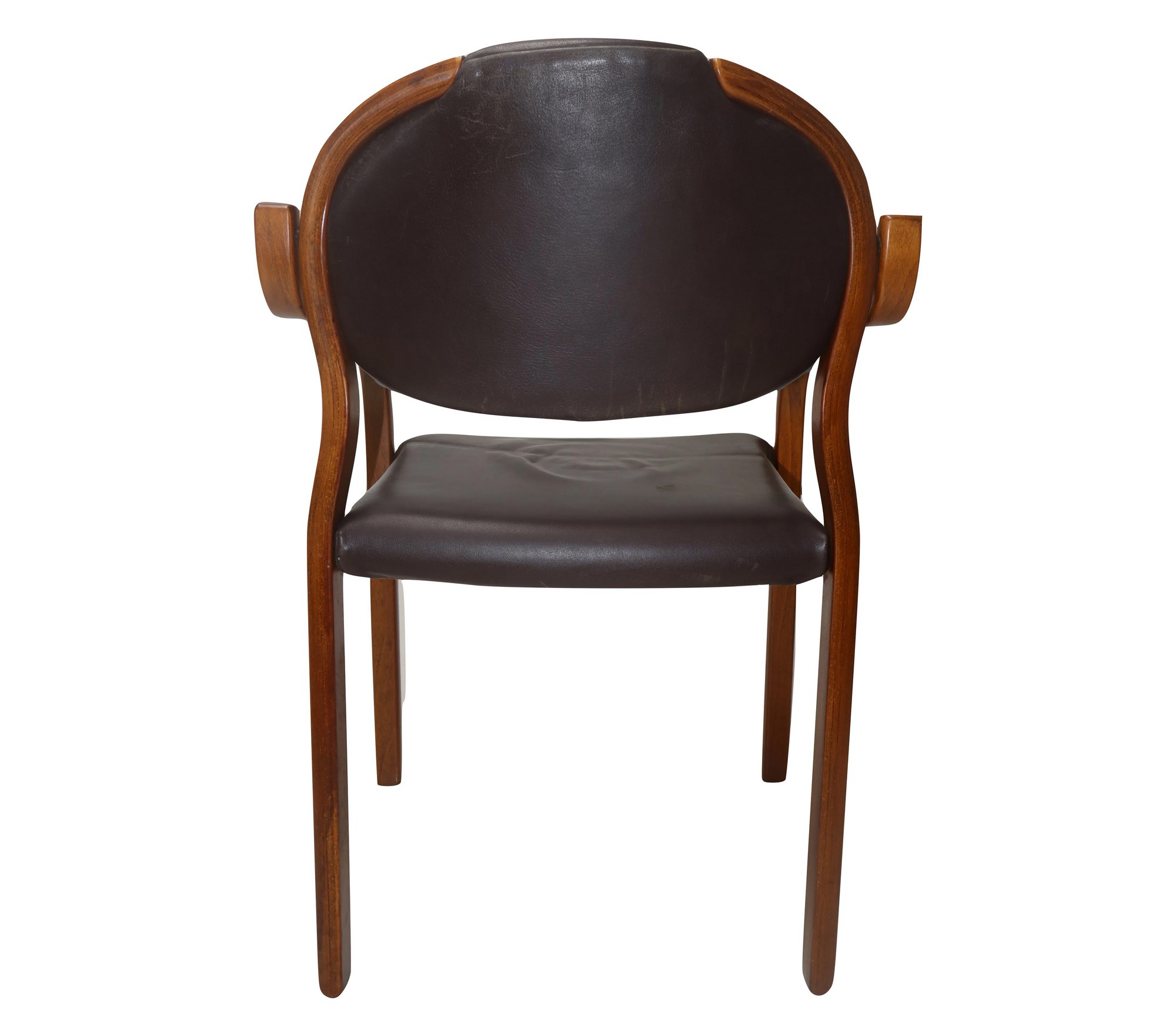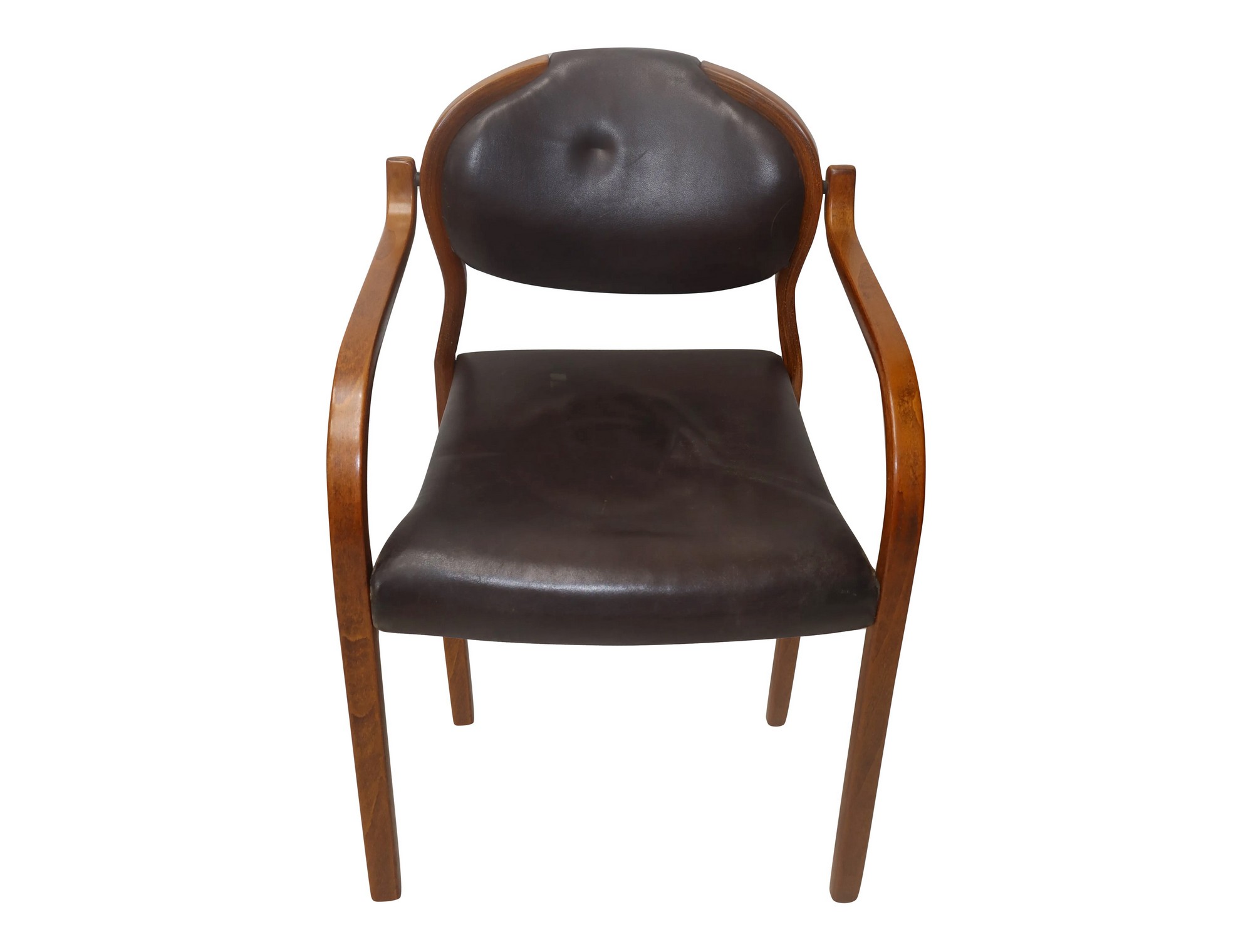 Poltroncina, XX secolo h cm 80, seduta cm 50 Seduta e spalliera in pelle, struttura in legno, usure sulla pelle