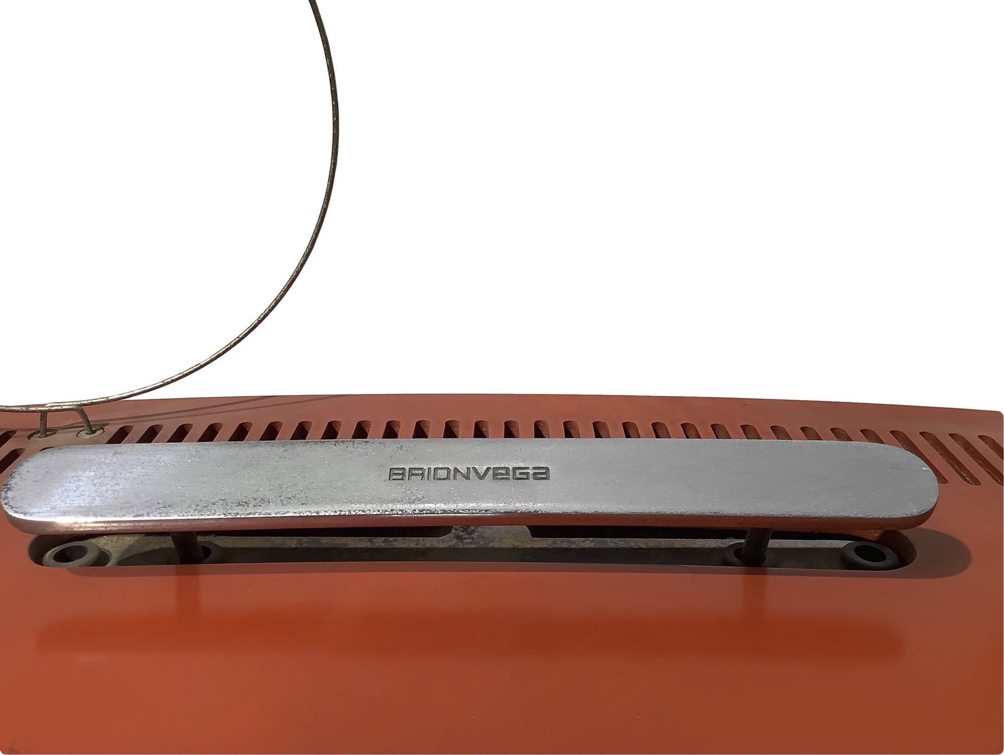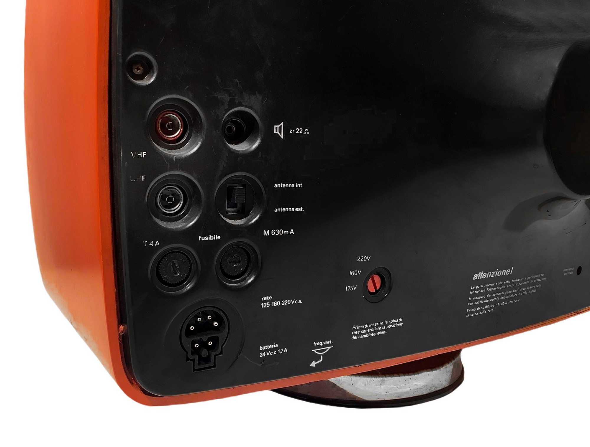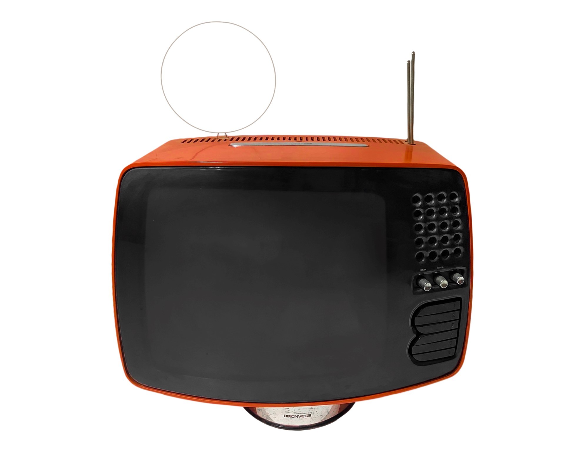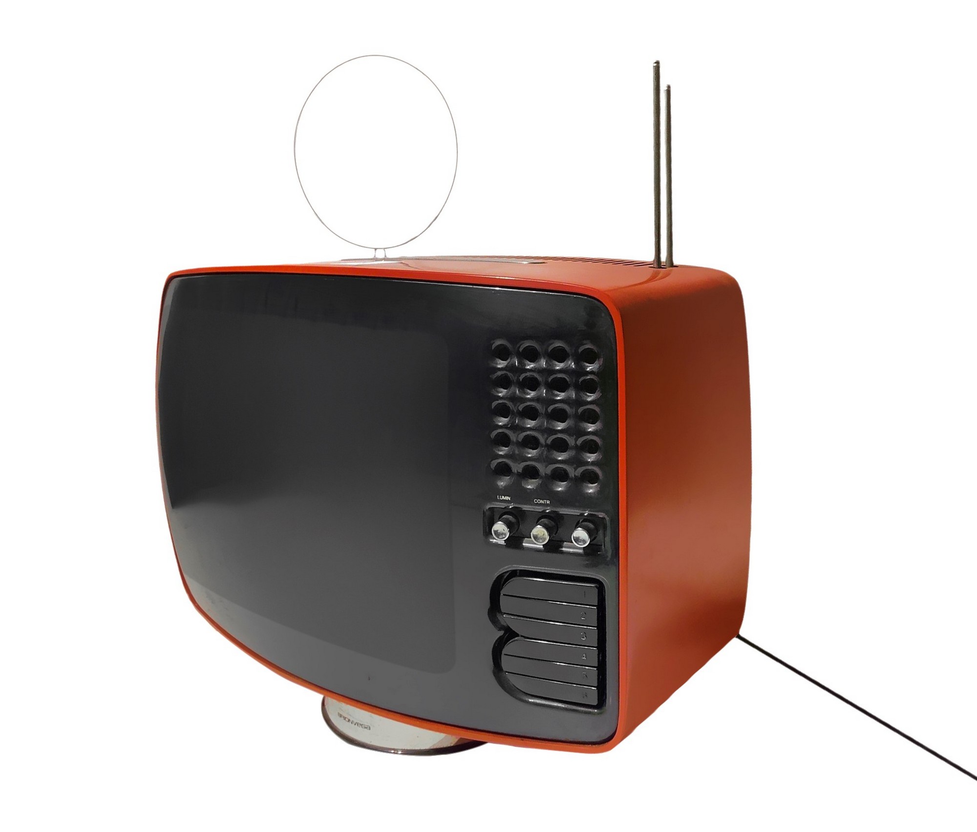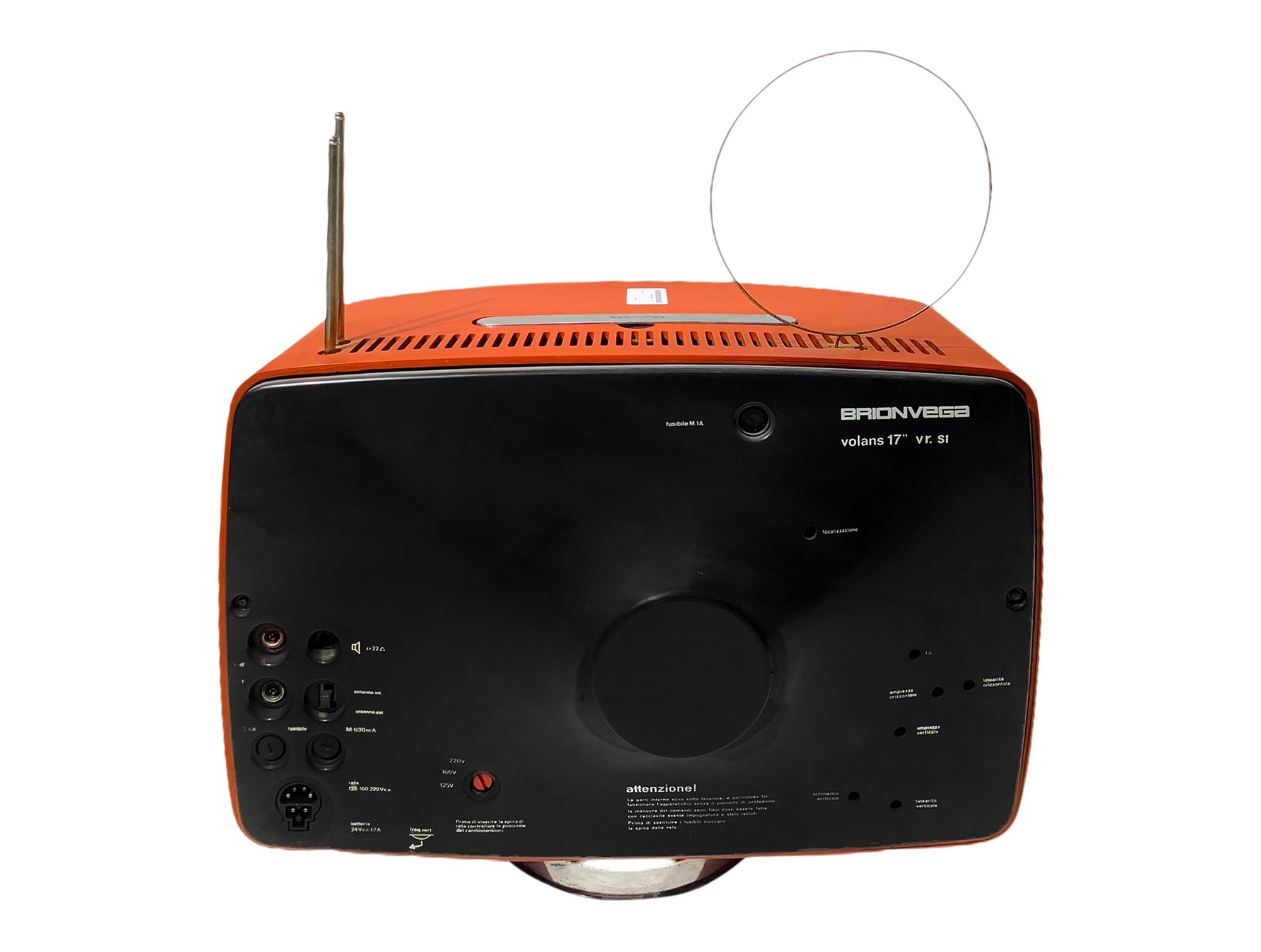 Televisore Brionvega in bianco e nero, modello Volans h 39, b 50x24,5 cm Produzione Brionvega, disegno Mario Bellini. Nei toni del rosso mattone. Da revisionare.