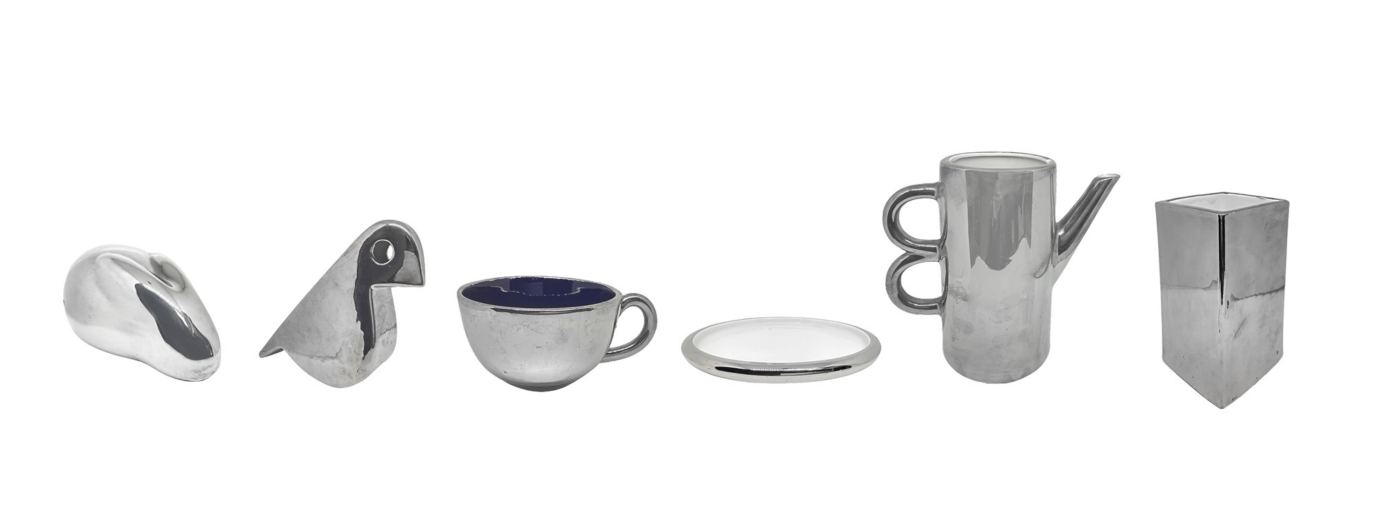 N. 5 oggetti in ceramica argentata nello stile di Bitossi raffiguranti animali stilizzati, uccello e coniglio, un vaso di forma rettangolare, una caraffa, una tazza con piattino e uno svuotatasche.