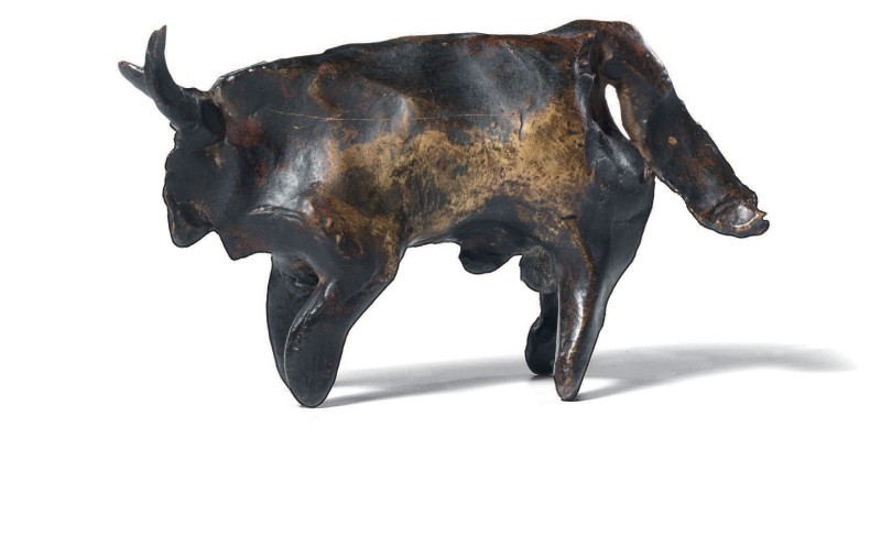 Pablo Picasso Malaga 1881 - Mougins 1973 Taureau, 1955-61 Scultura in bronzo, es. 3/12, cm. 6,5x11 Tiratura sotto la pancia: 3/12. Storia: Collezione Giampaolo Buzzanca, Padova; Collezione privata Esposizioni: Una collezione internazionale di piccole sculture del secondo Novecento, Malcesine, Castello scaligero, 11 giugno - 15 settembre 2005, cat. p. 64, illustrata a colori. Realizzata nel 1961 in 12 esemplari da un gesso originale del 1955.