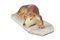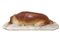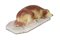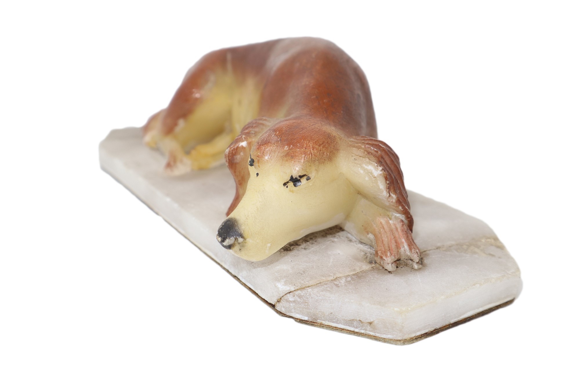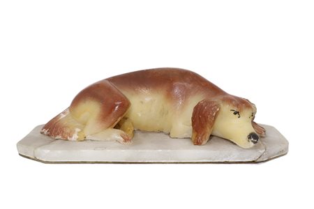 Cane in alabastro policromo, 20° secolo h cm 5,5; base cm 18 x cm 6,5 Su base bianca