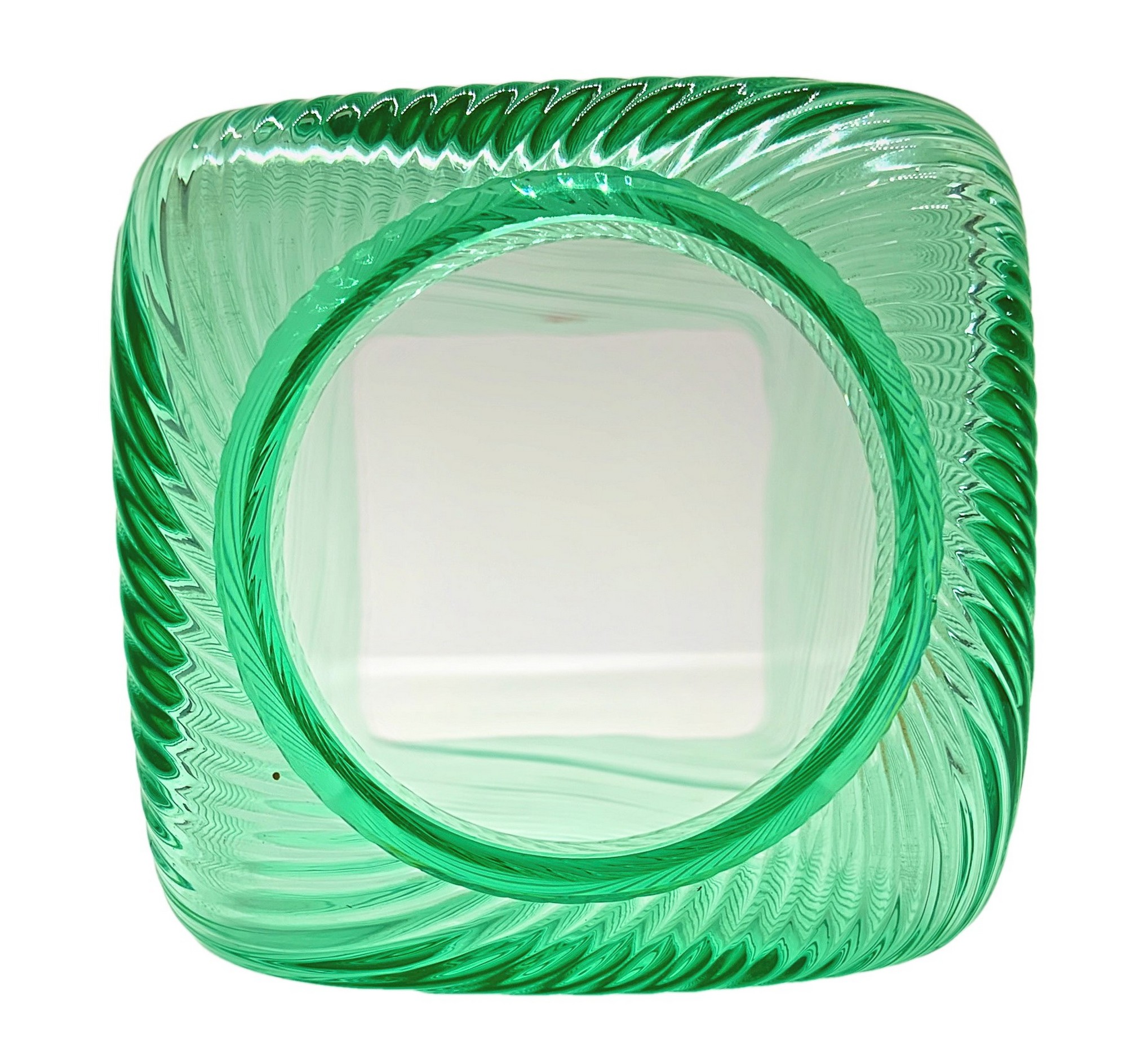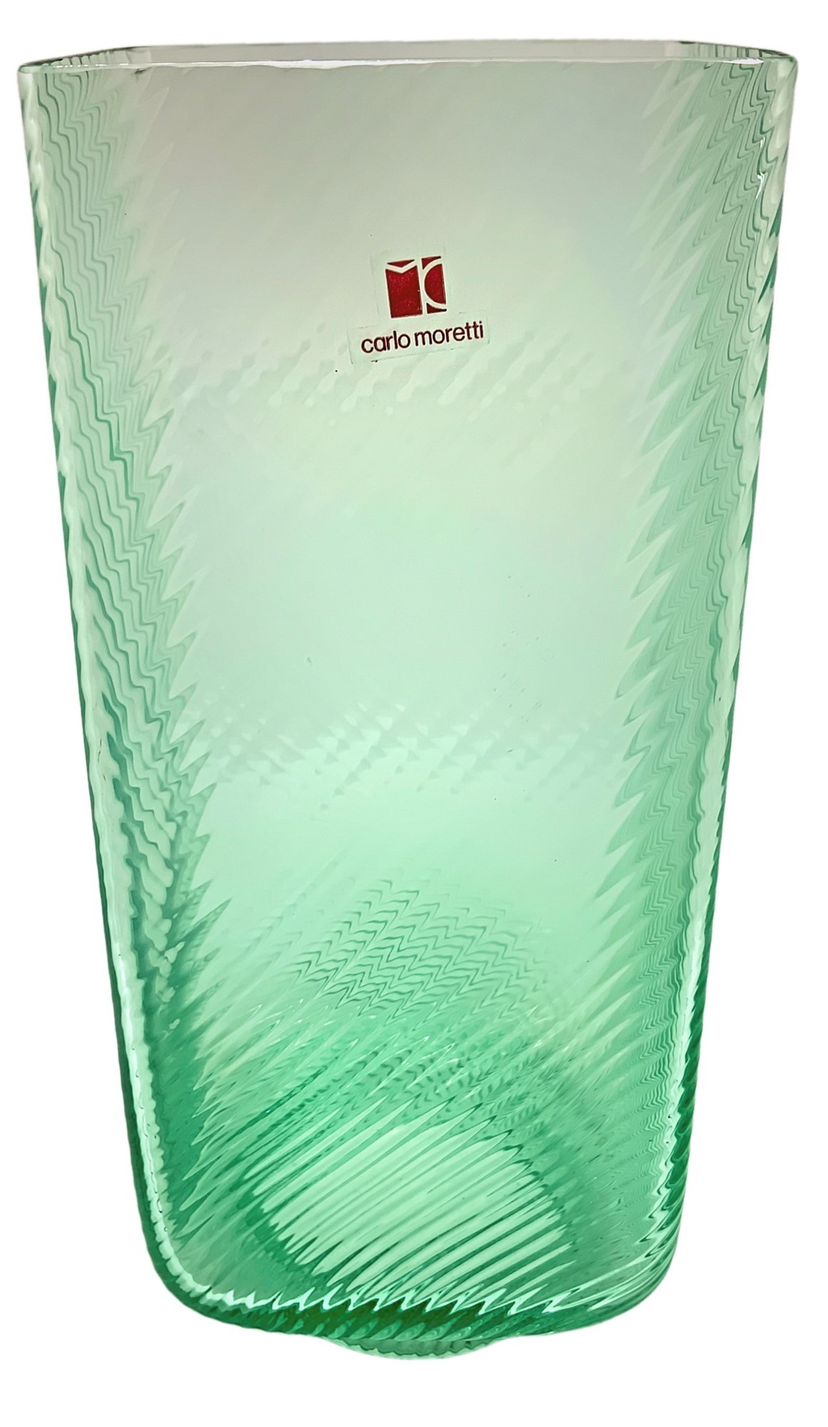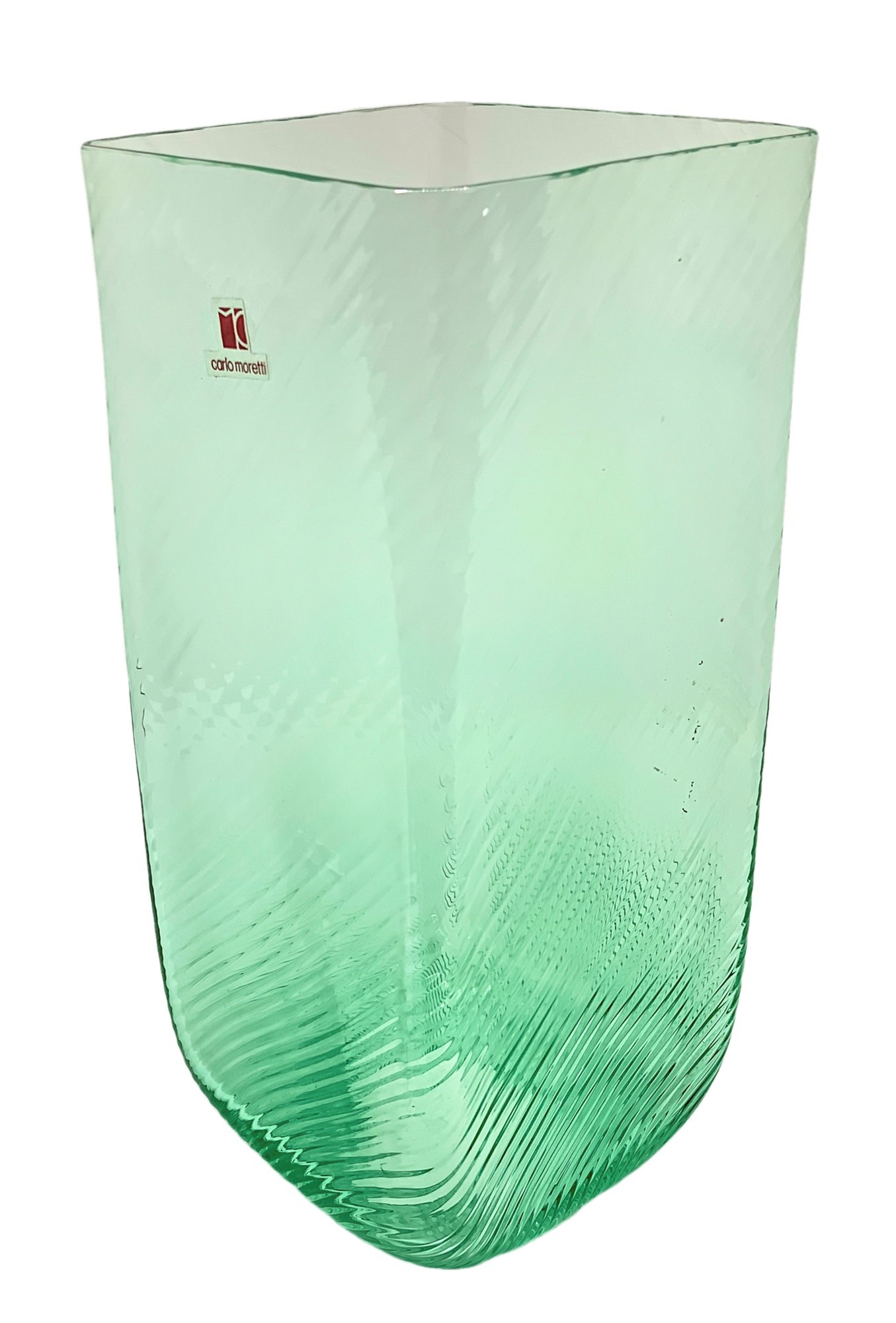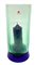 Portacandela produzione Carlo Moretti e base circolare H cm 28. Diametro cm 14 in vetro blu e diffusore in vetro verde con sottili costolature.