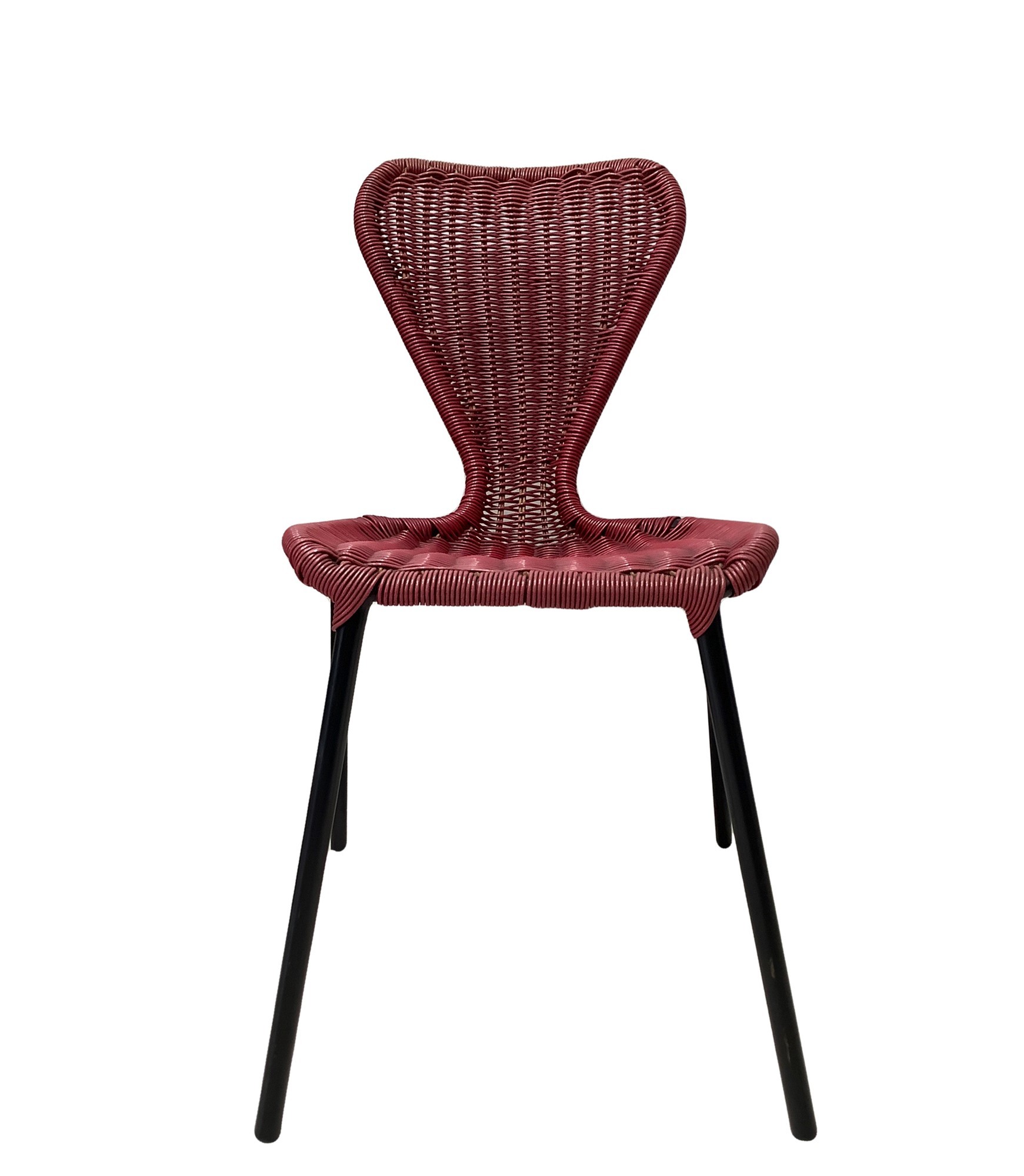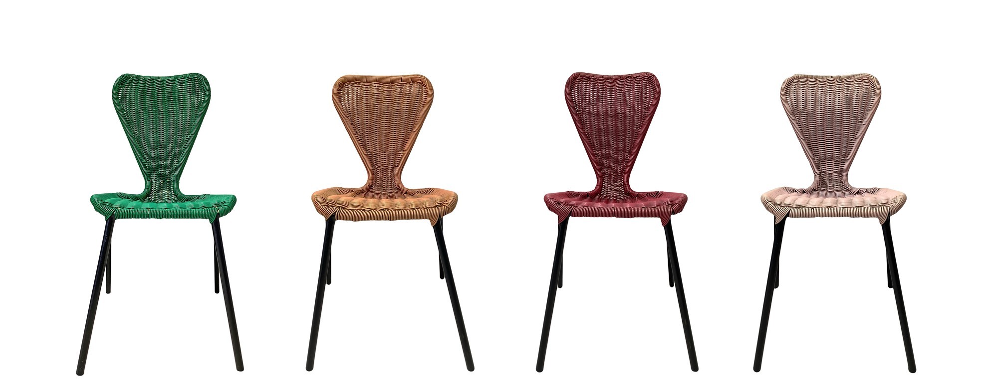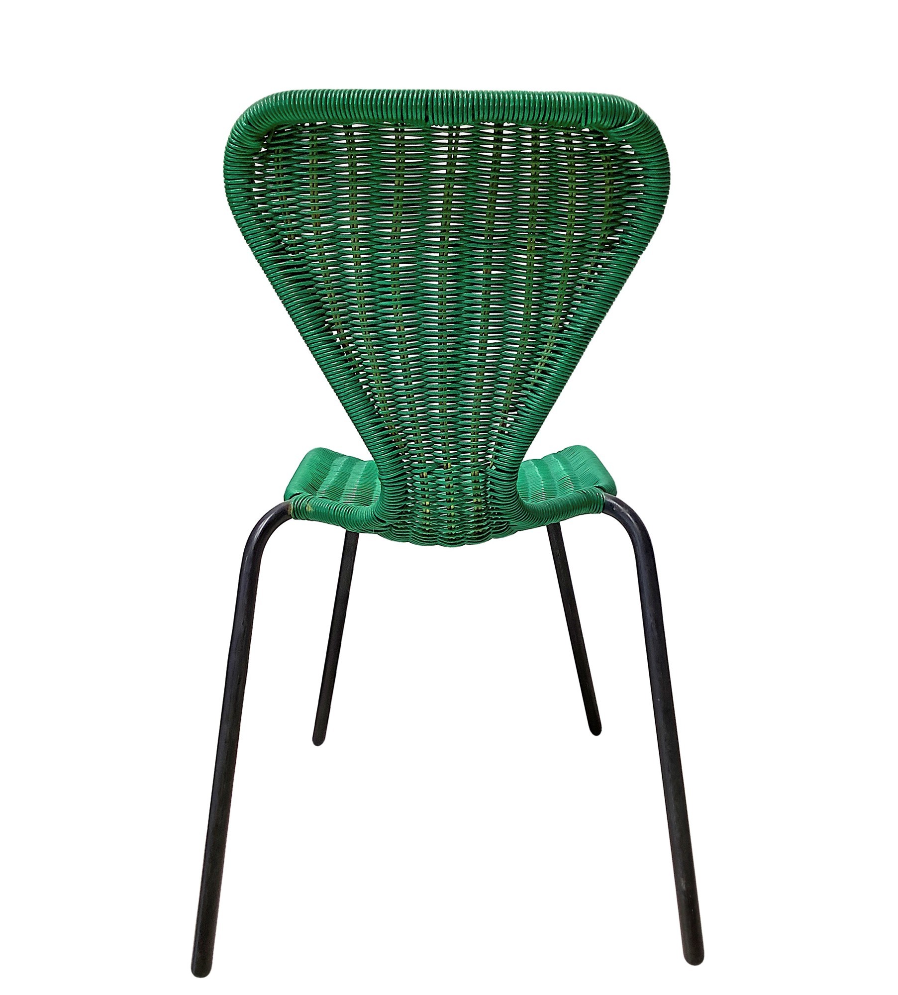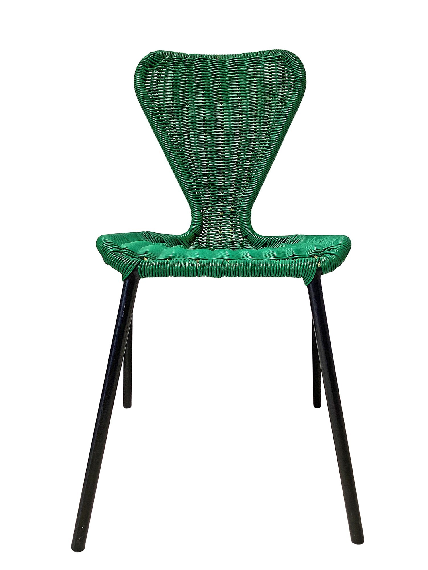 Gruppo di quattro sedie h cm 74; seduta cm 43, larghezza cm 36, profondità cm 40 Strutture in metallo laccato nero rivestimento in intreccio di cordaplastica in colori diversi. Colori verde, arancione ,rosa e rosso. Segni d'uso.