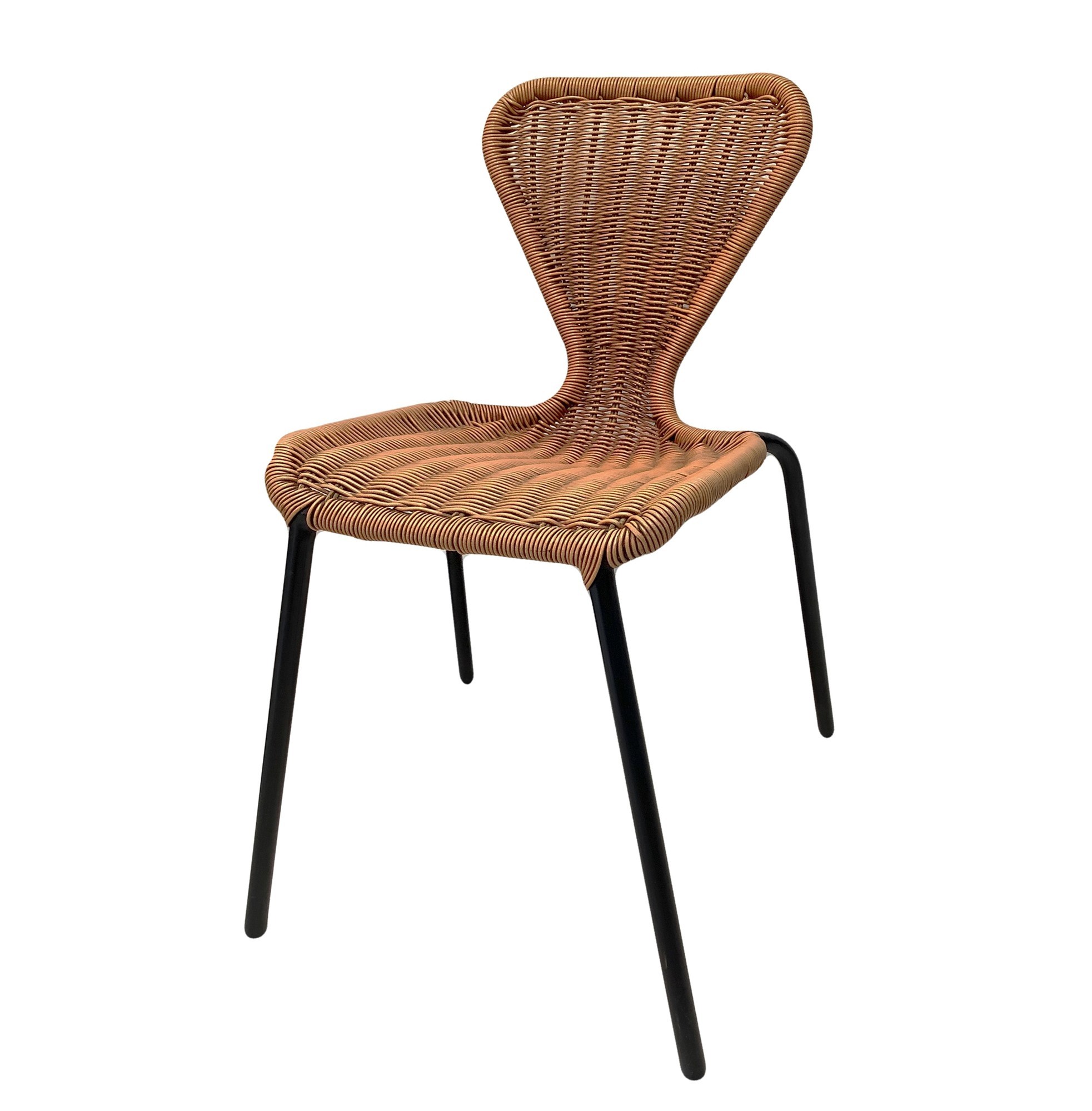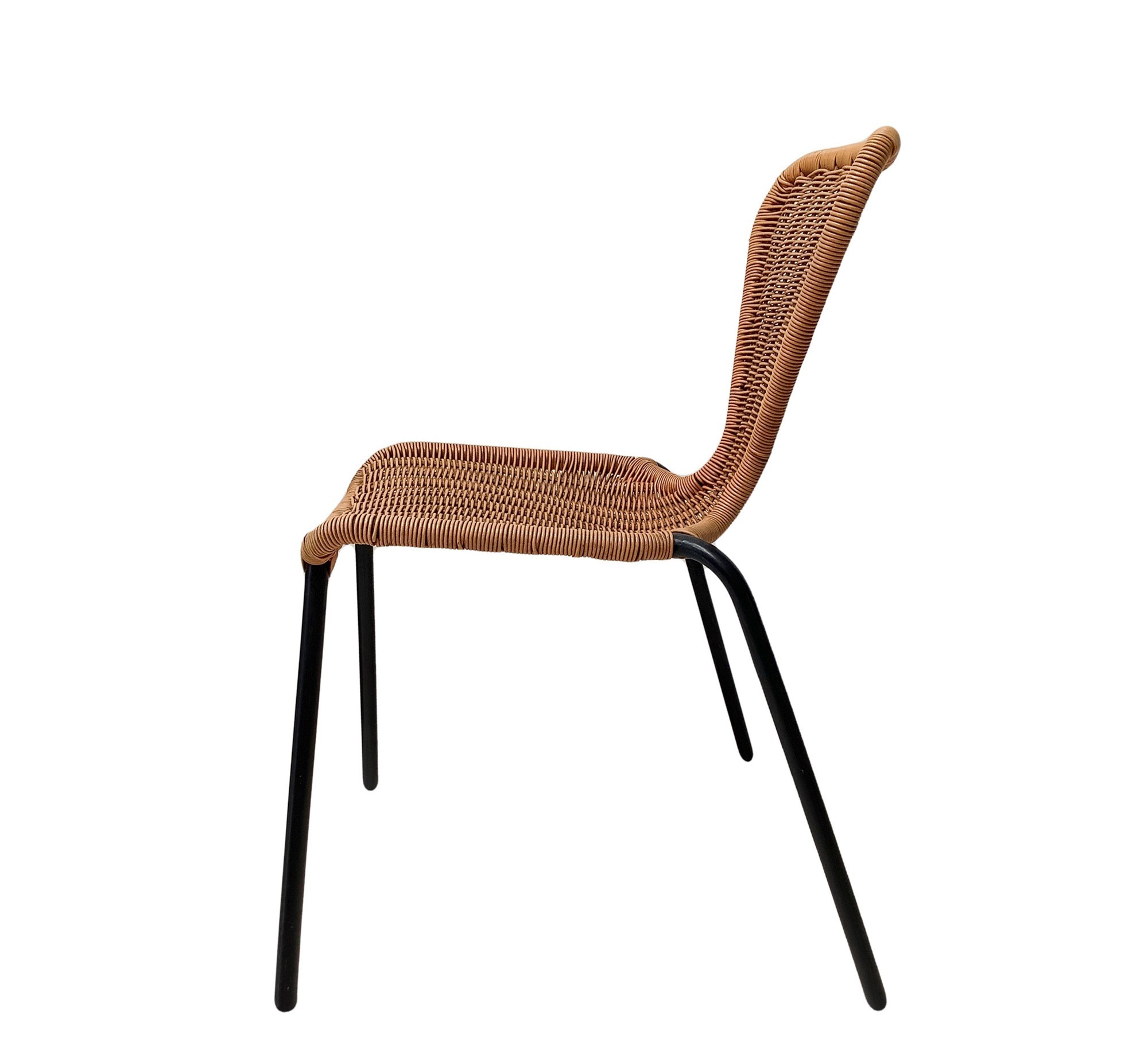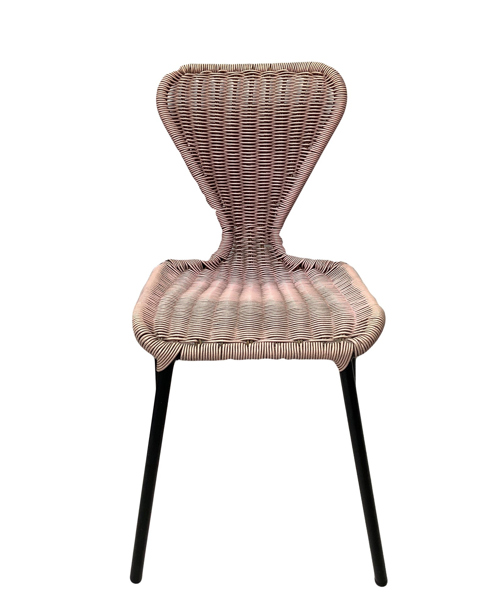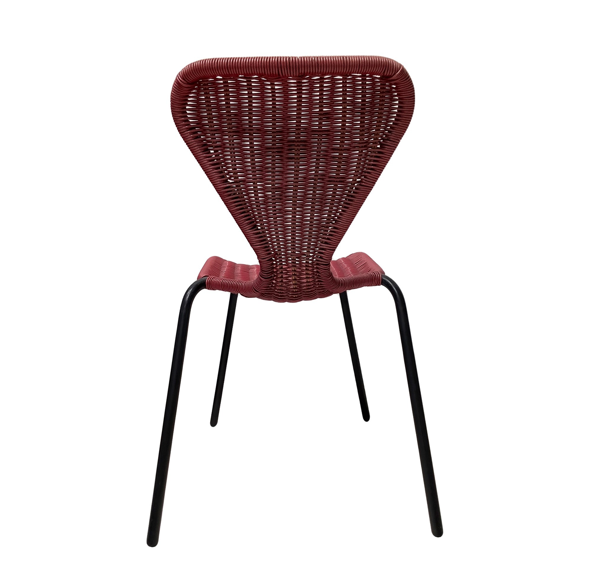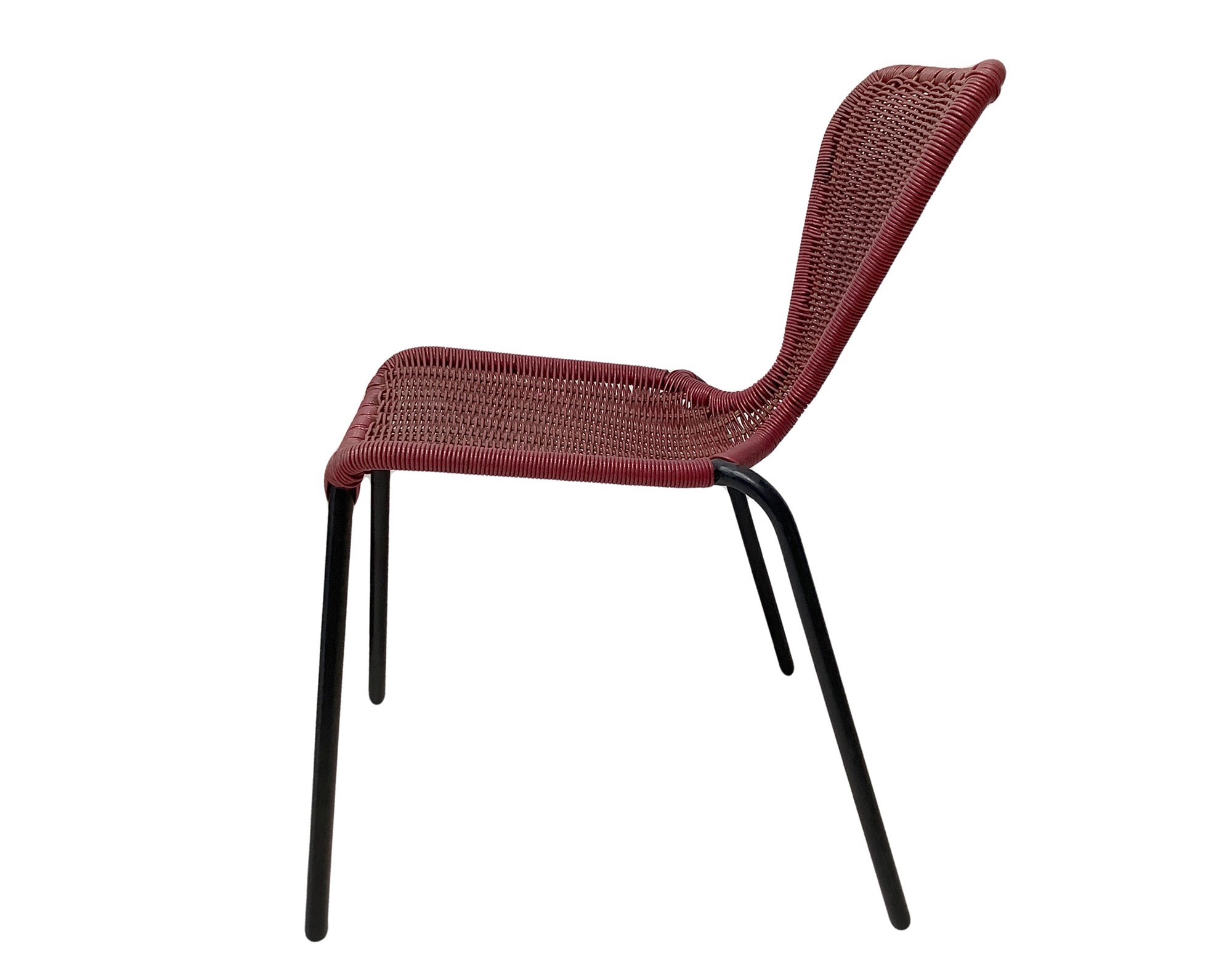 Gruppo di quattro sedie h cm 74; seduta cm 43, larghezza cm 36, profondità cm 40 Strutture in metallo laccato nero rivestimento in intreccio di cordaplastica in colori diversi. Colori verde, arancione ,rosa e rosso. Segni d'uso.