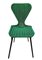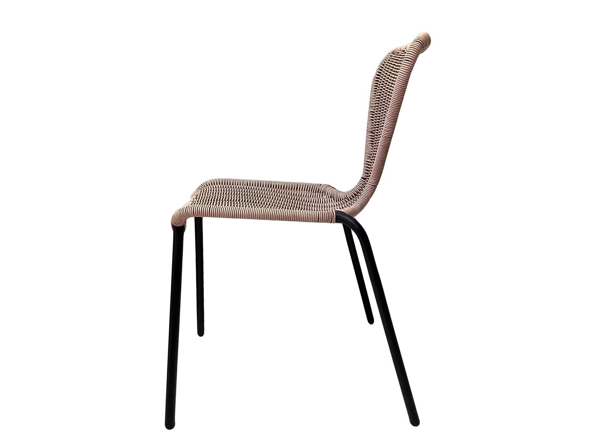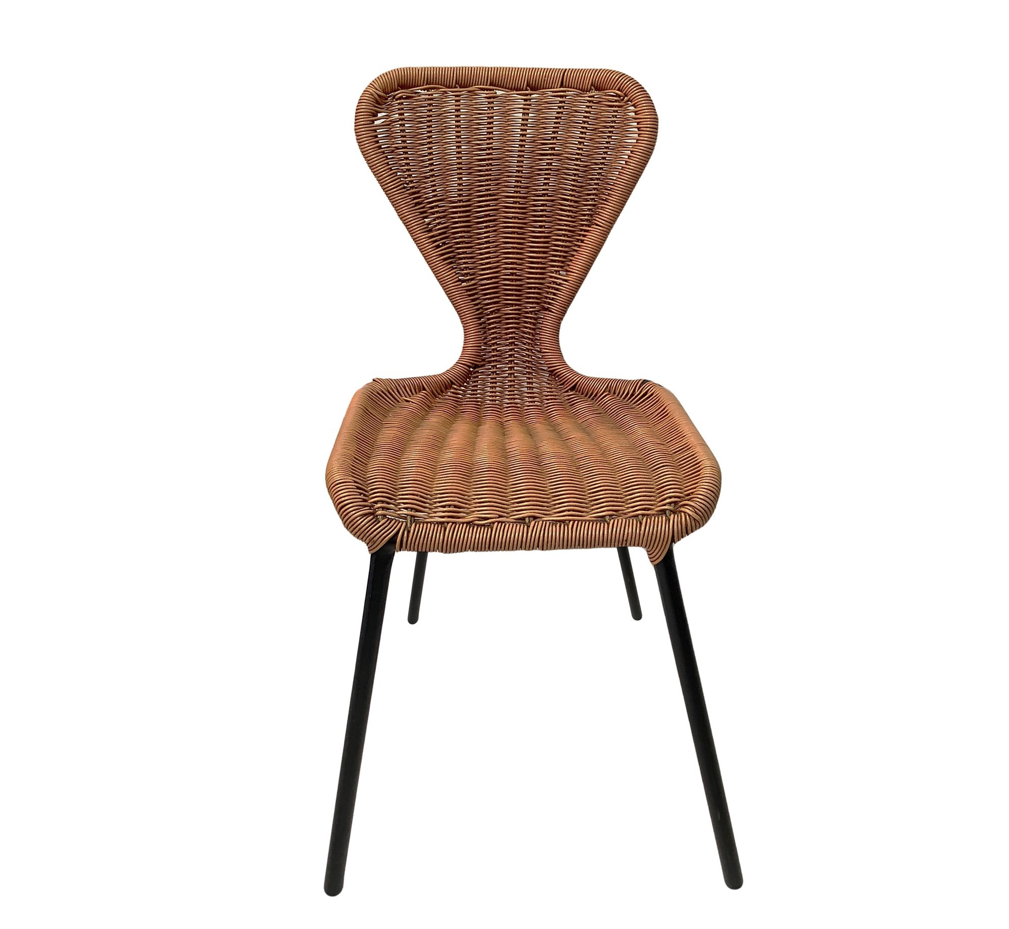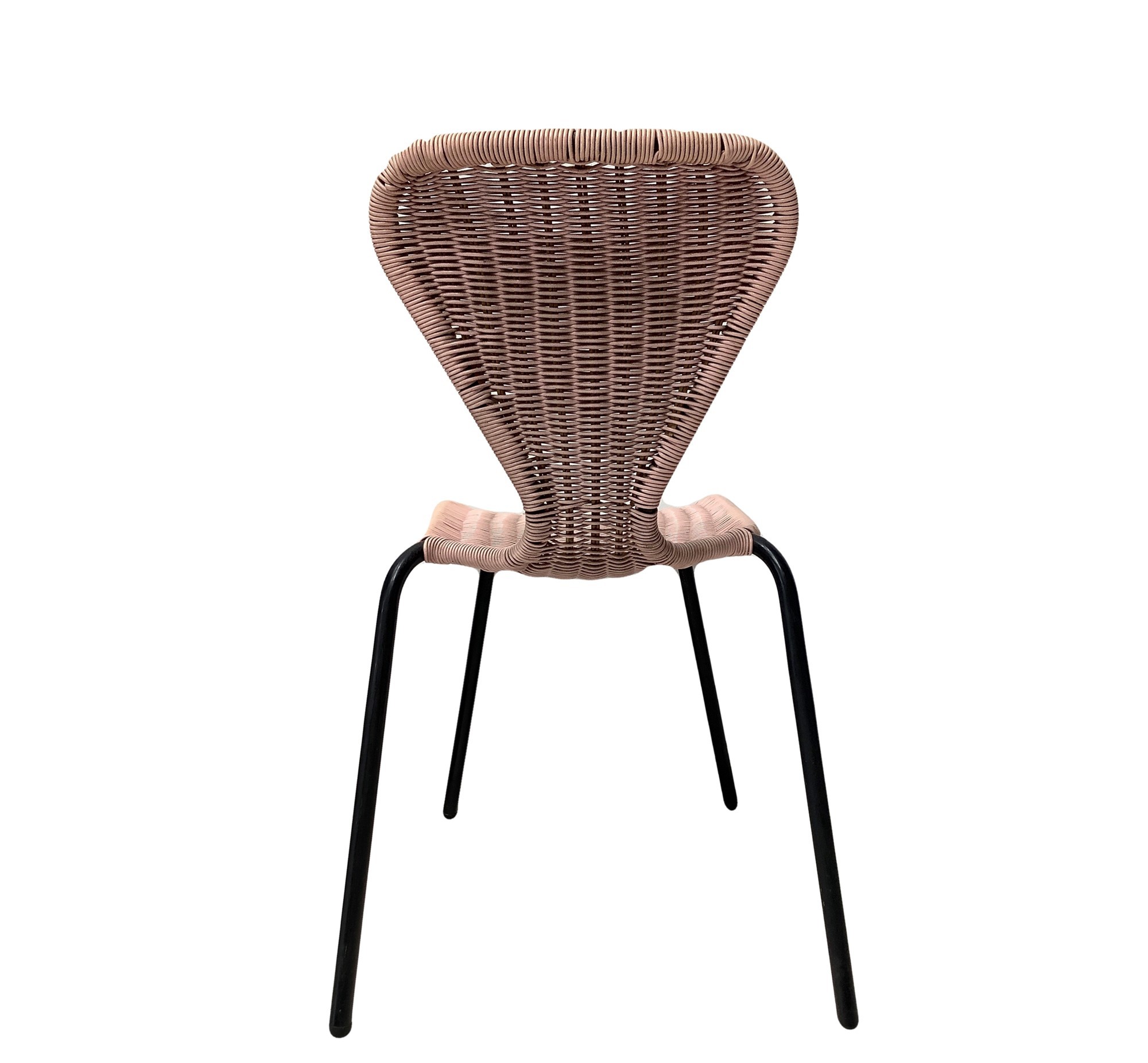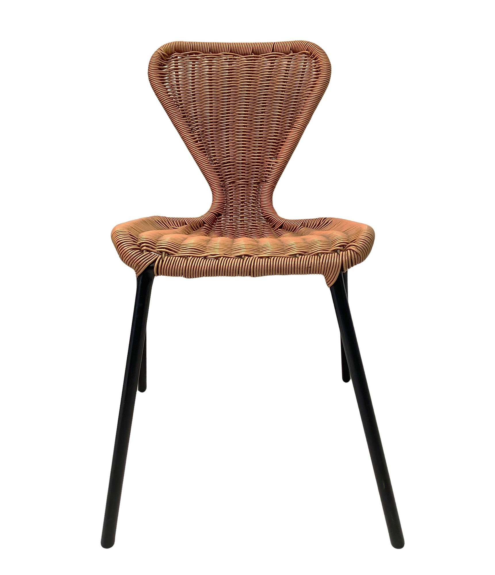 Gruppo di quattro sedie h cm 74; seduta cm 43, larghezza cm 36, profondità cm 40 Strutture in metallo laccato nero rivestimento in intreccio di cordaplastica in colori diversi. Colori verde, arancione ,rosa e rosso. Segni d'uso.