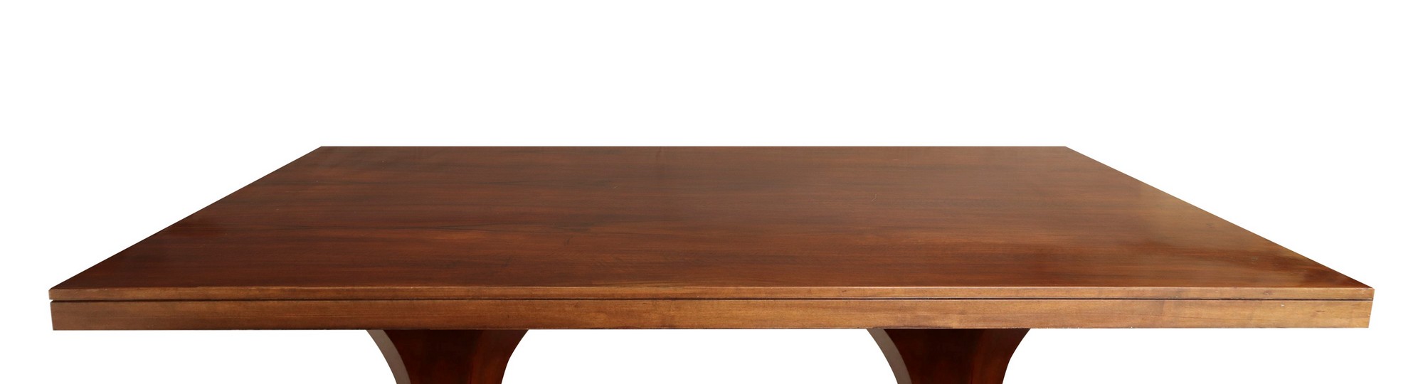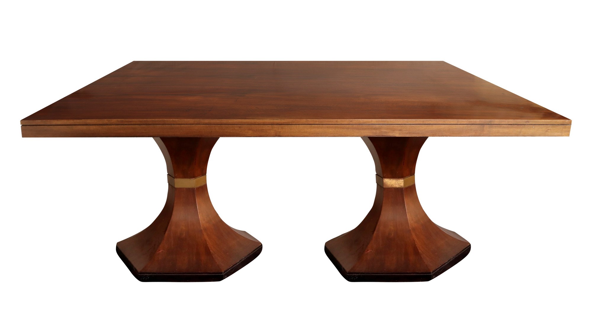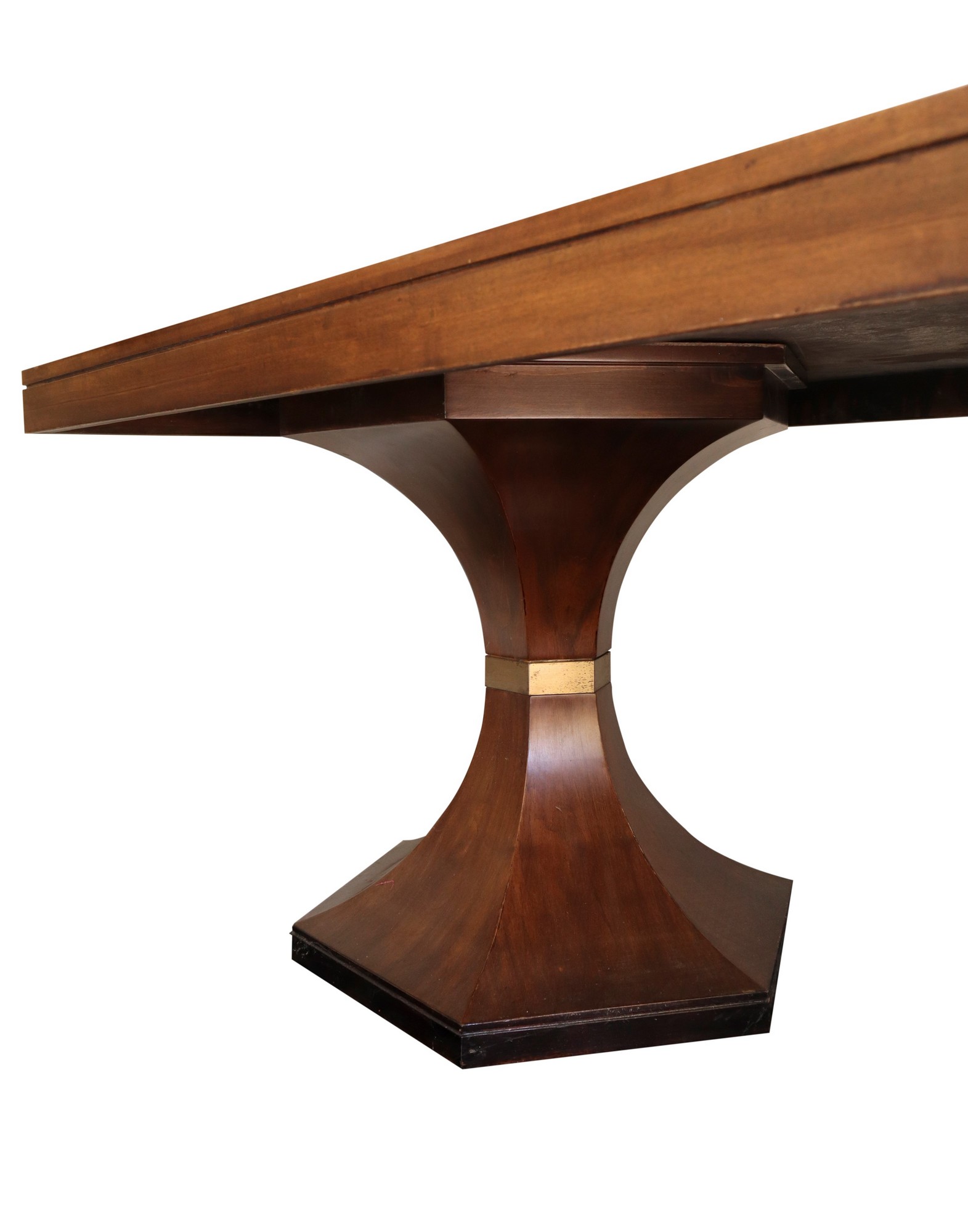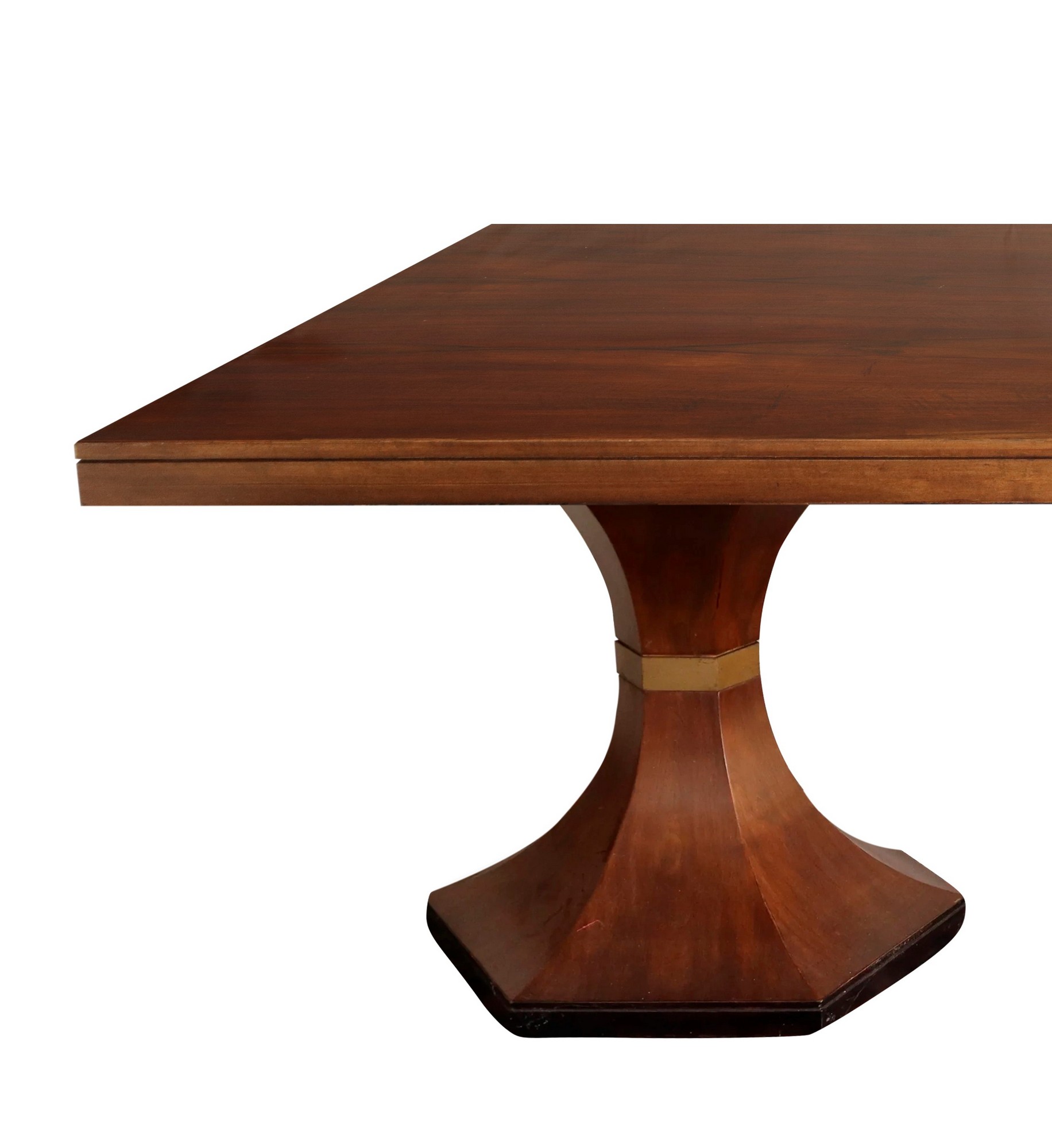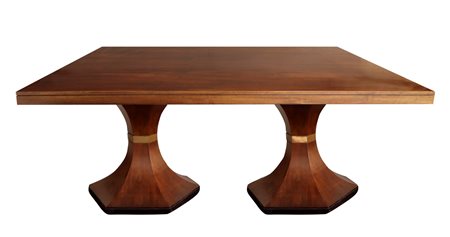 Frigerio Bidesi (attribuito a) - Tavolo in legno cm 76 x cm 200 x cm 100 Produzione italiana. Tavolo con piano rettangolare in noce, doppio piede in mogano con base esagonale e dettaglio in ottone. Tracce di ossido e segni di uso