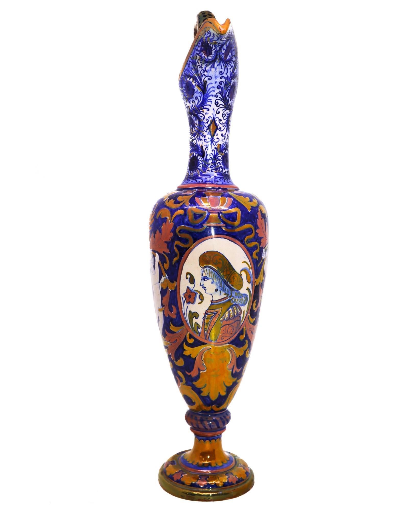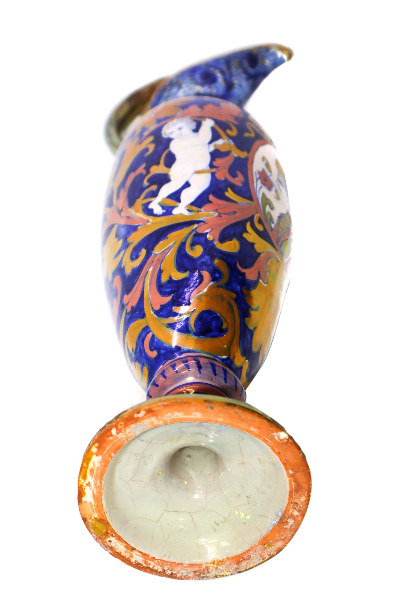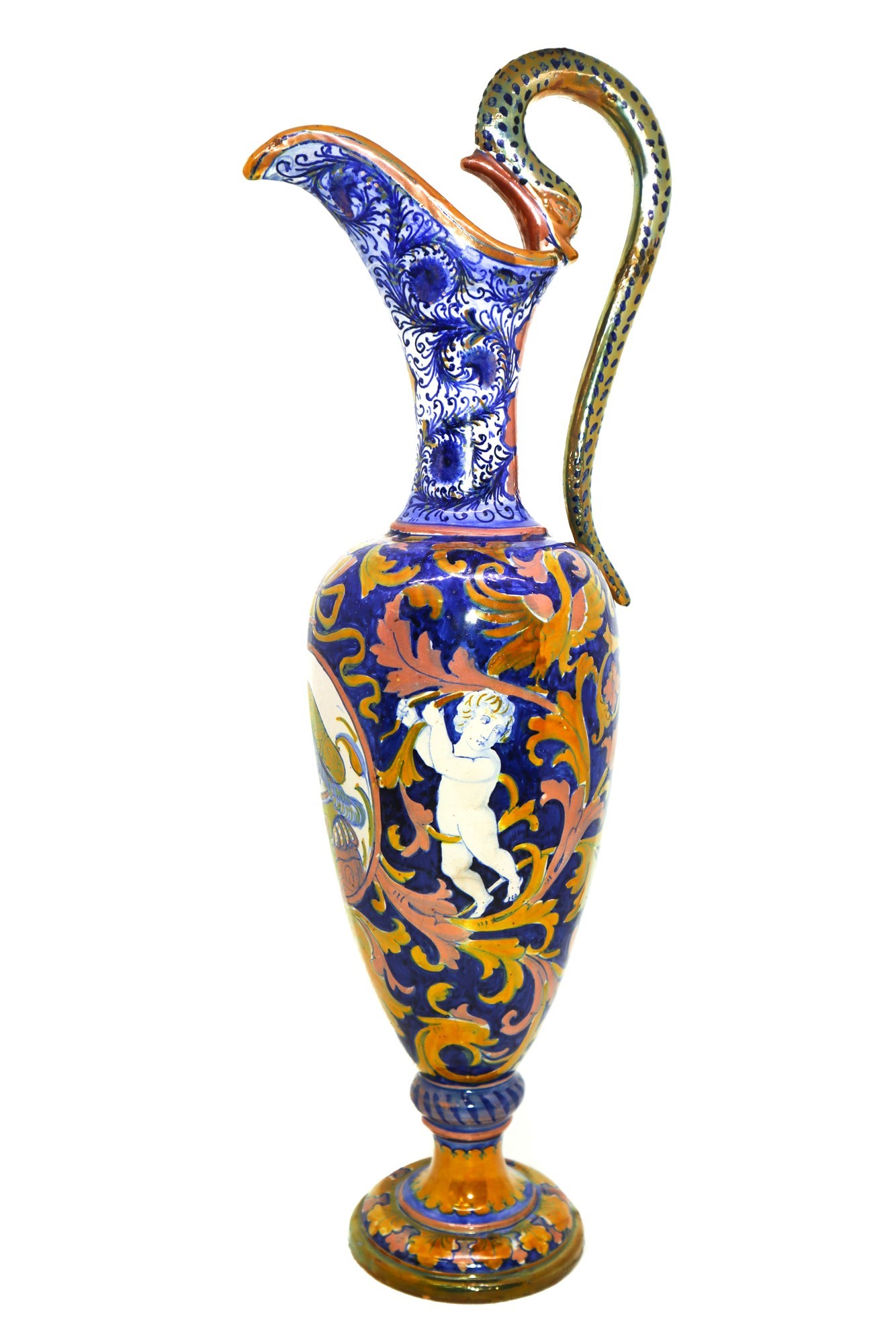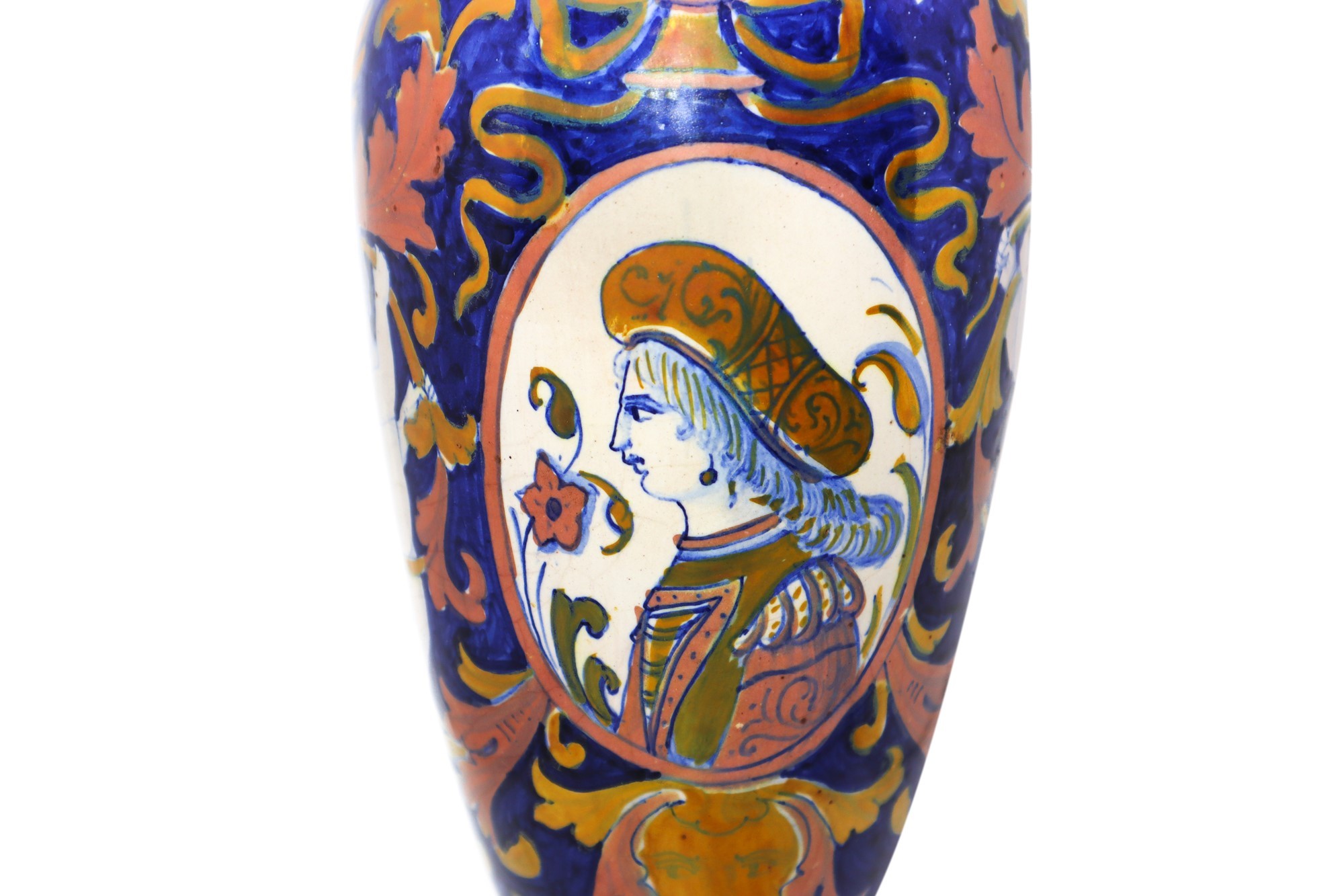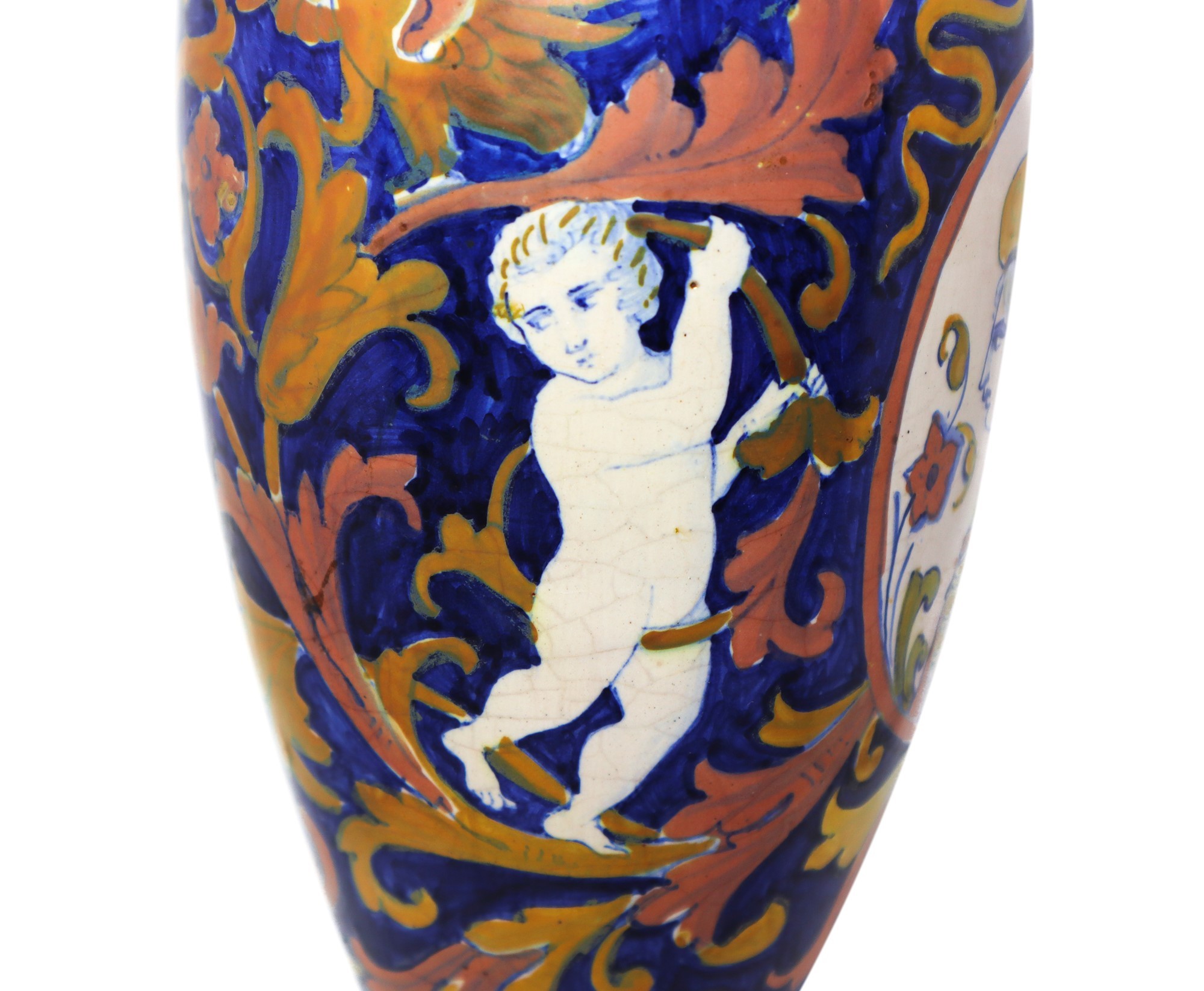 Anfora in ceramica smaltata a lustro h cm 40 Con manico e medaglione centrale e disegni di puttini finerali, disegno a larghe foglie in oro.