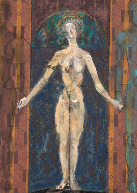 Bruno Ceccobelli Monte Castello Vibio (Pg) 1952 Benedetta tra testimoni, 2002 Tecnica mista su tessuto teso su tavola, cm. 184,5x130,4 Sigla, data e titolo al verso sulla tavola: BC 02 / Benedetta tra testimoni. Storia: Collezione privata, Verona; Collezione privata Foto autenticata dall'artista, Todi, 12.08.03, con n. BC 147AA.