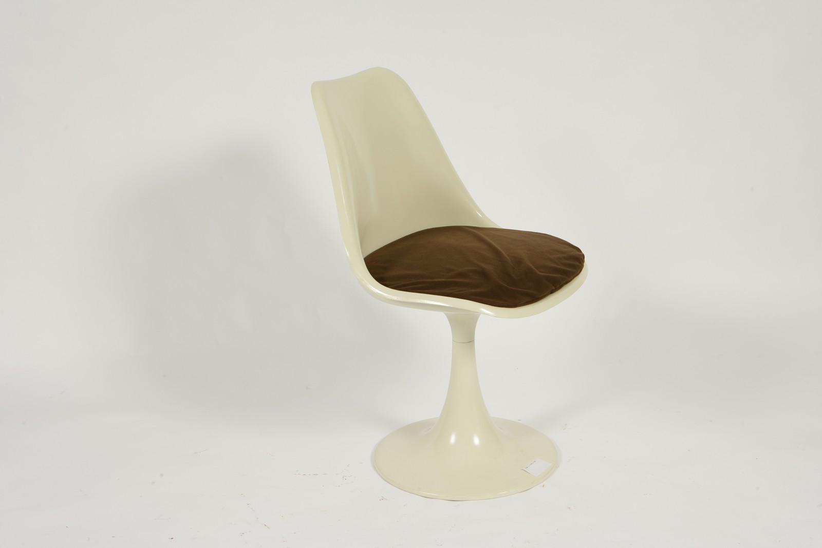 SAARINEN EERO. Sedia girevole Tulip, base di metallo laccato lucido bianco e scocca in ABS. Swivel chair Tulip,base in white lacquered metal,body in ABS Abs. Cm 51,5x82,5x50. Cuscino marrone. Produzione italiana per Play. Brown pillow. Italian work for Play. 1940.