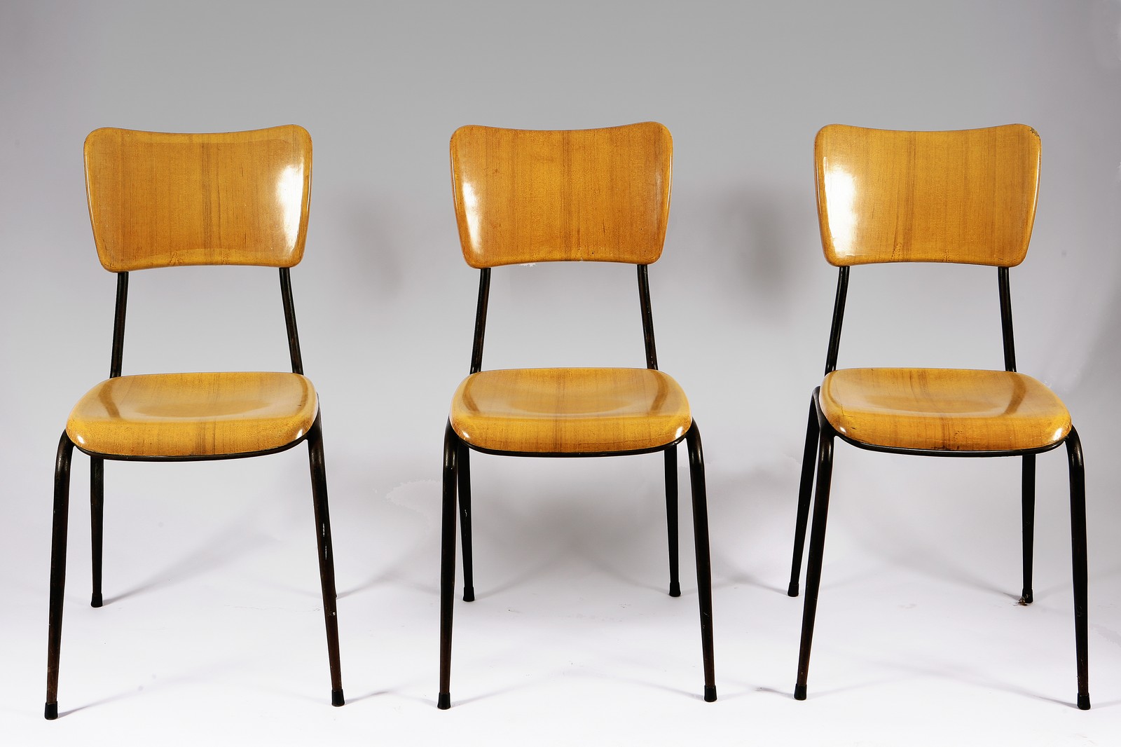 PRODUZIONE ITALIANA - ITALIAN WORK. Tre sedie in ferro pieno e bachelite. Three full-iron chairs and Bakelite. Ferro acciaio e bachelite. Cm 38x83x48. 1950 ca.