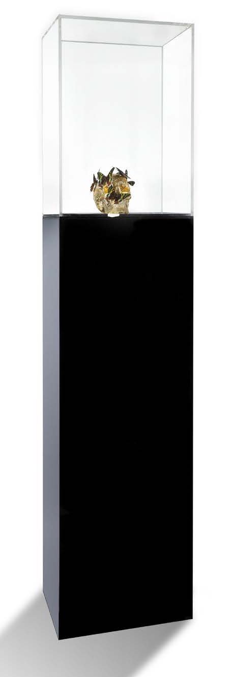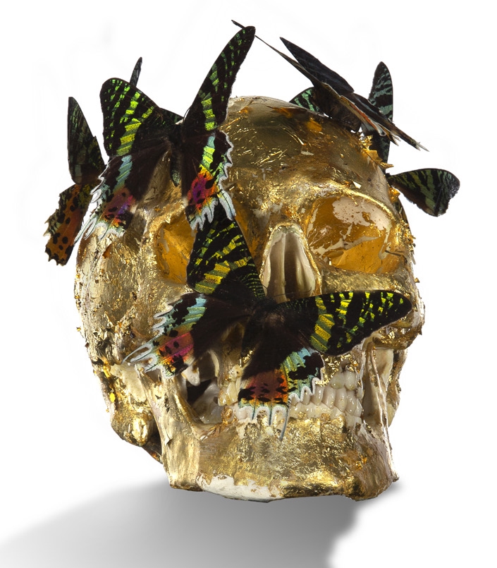 Resin skull, golden sheet and mounted Chrysiridia ripheus butterflies, plexiglas base