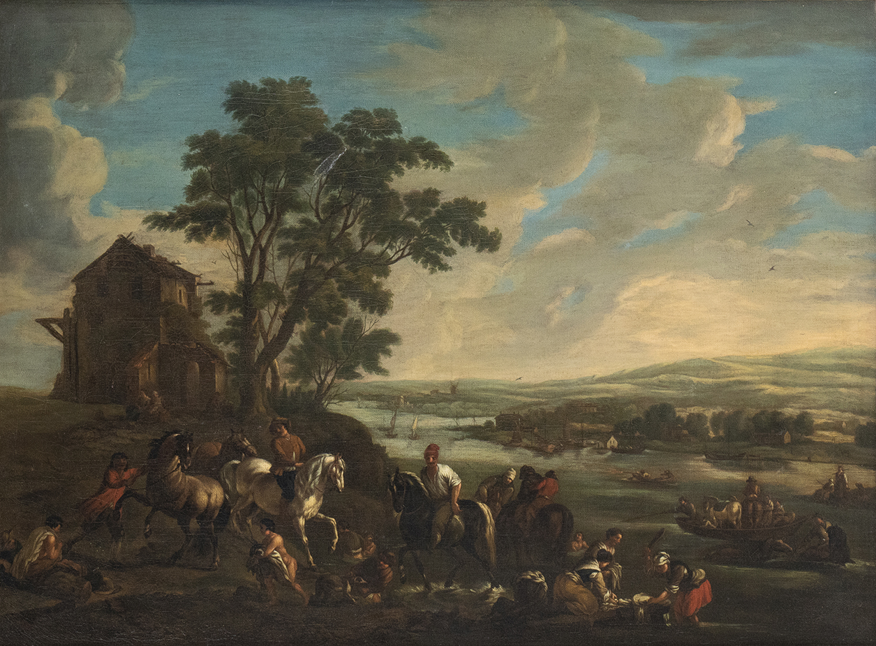 Paesaggio fluviale con cavalieri, viandanti e lavandaie