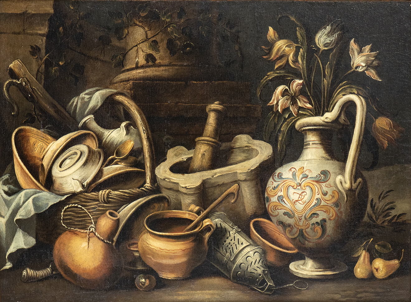 Natura morta con stoviglie, mortaio e vaso di fiori