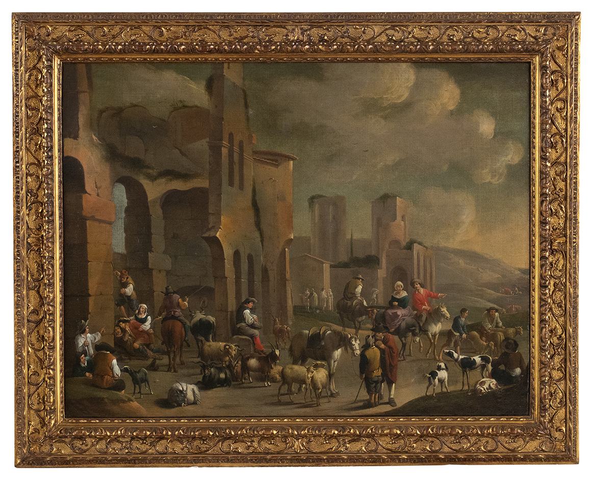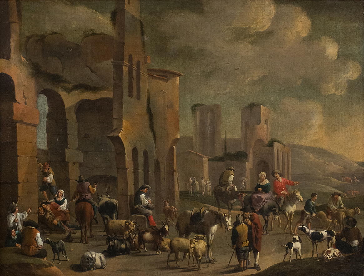Pieter van Bredael, fu allievo ad Anversa di David Ryckaert III nel 1640, divenendo maestro della Gilda di San Luca nel 1651. Le sue opere combinano in modo idiomatico gli elementi ricorrenti della coeva pittura di genere fiamminga con un immaginario più italiano, legato alle opere dei bamboccianti e spesso caratterizzato da un ambientazione architettonica di gusto classico. La nostra tela maestosa va ricondotta appieno a questa parte della produzione di Bredael e consente di cogliere al meglio gli aspetti principali tipici della sua pittura. La movimentata scena pastorale fitta di figure e animali È cosÌ situata all’imbrunire all’interno di una scenografia di ruderi archeologici idealmente ispirata alla campagna romana.