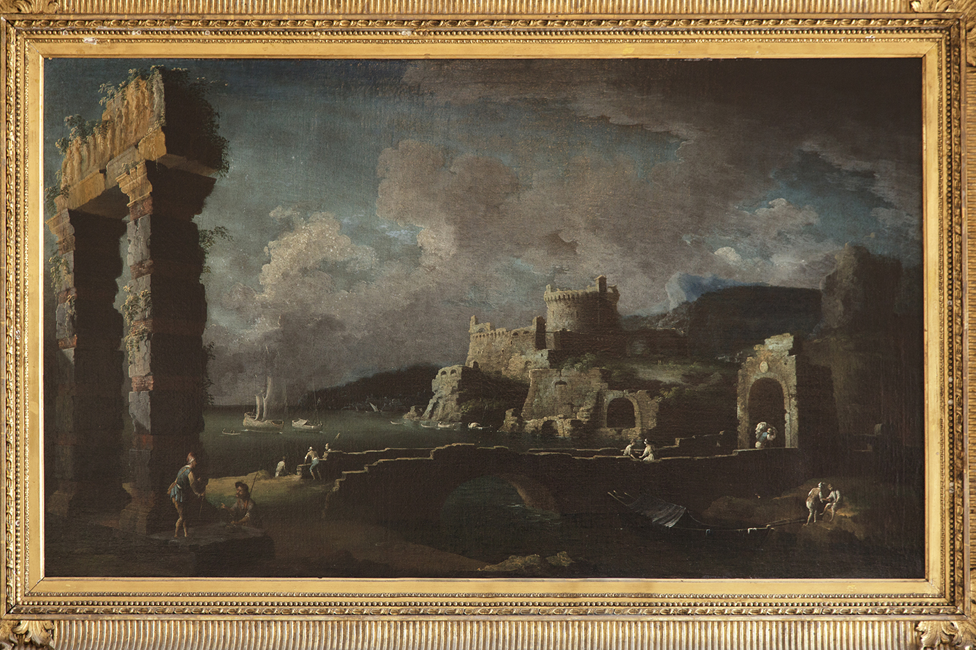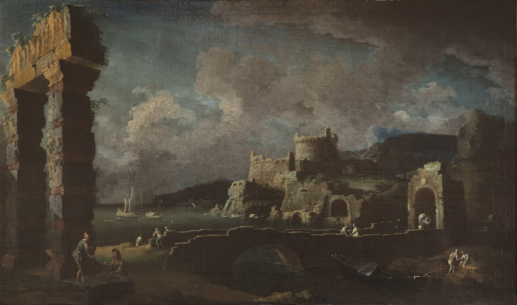 Capriccio costiero con ruderi, ponte, figure e fortezza sullo sfondo
