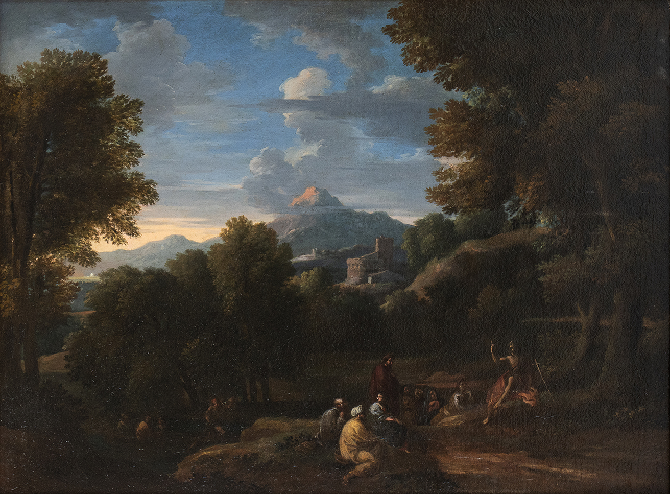 Paesaggio con predica del Battista e borgo fortificato sullo sfondo
