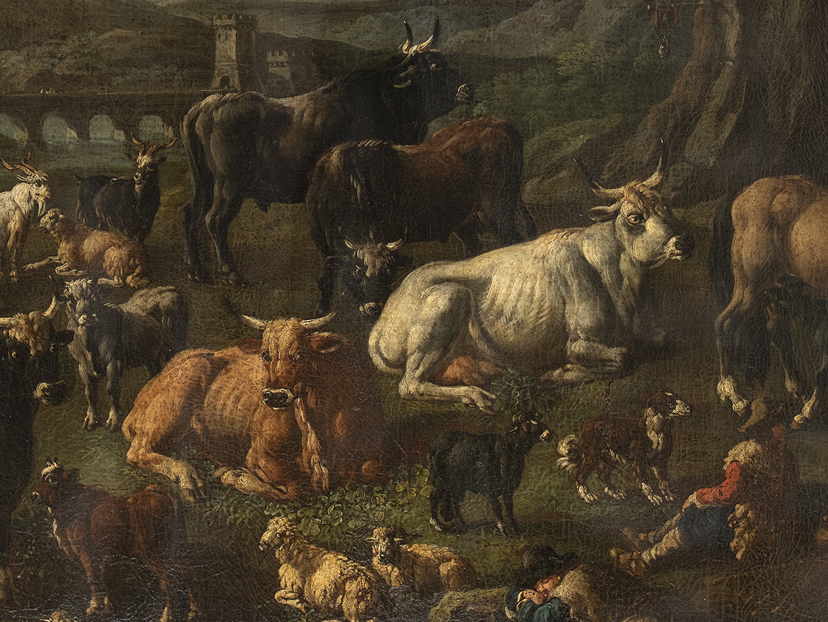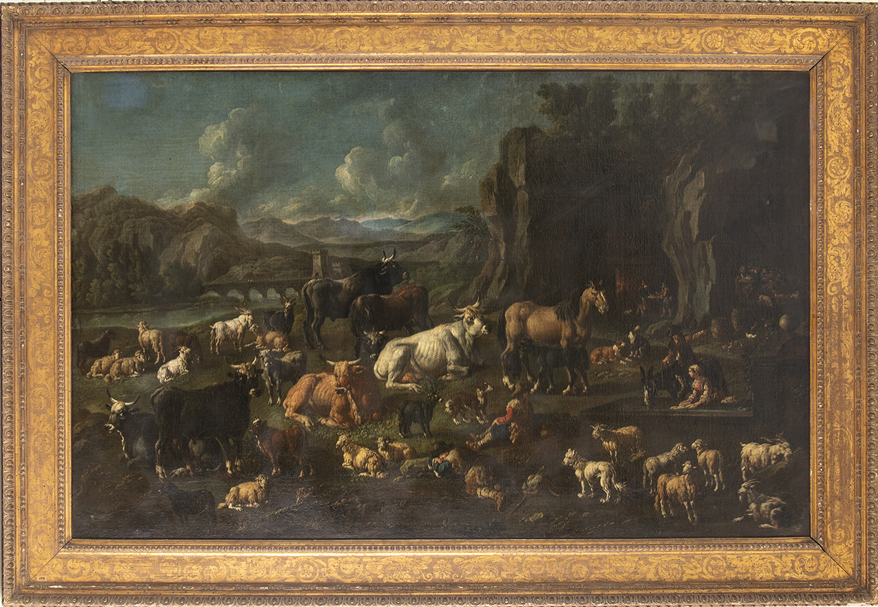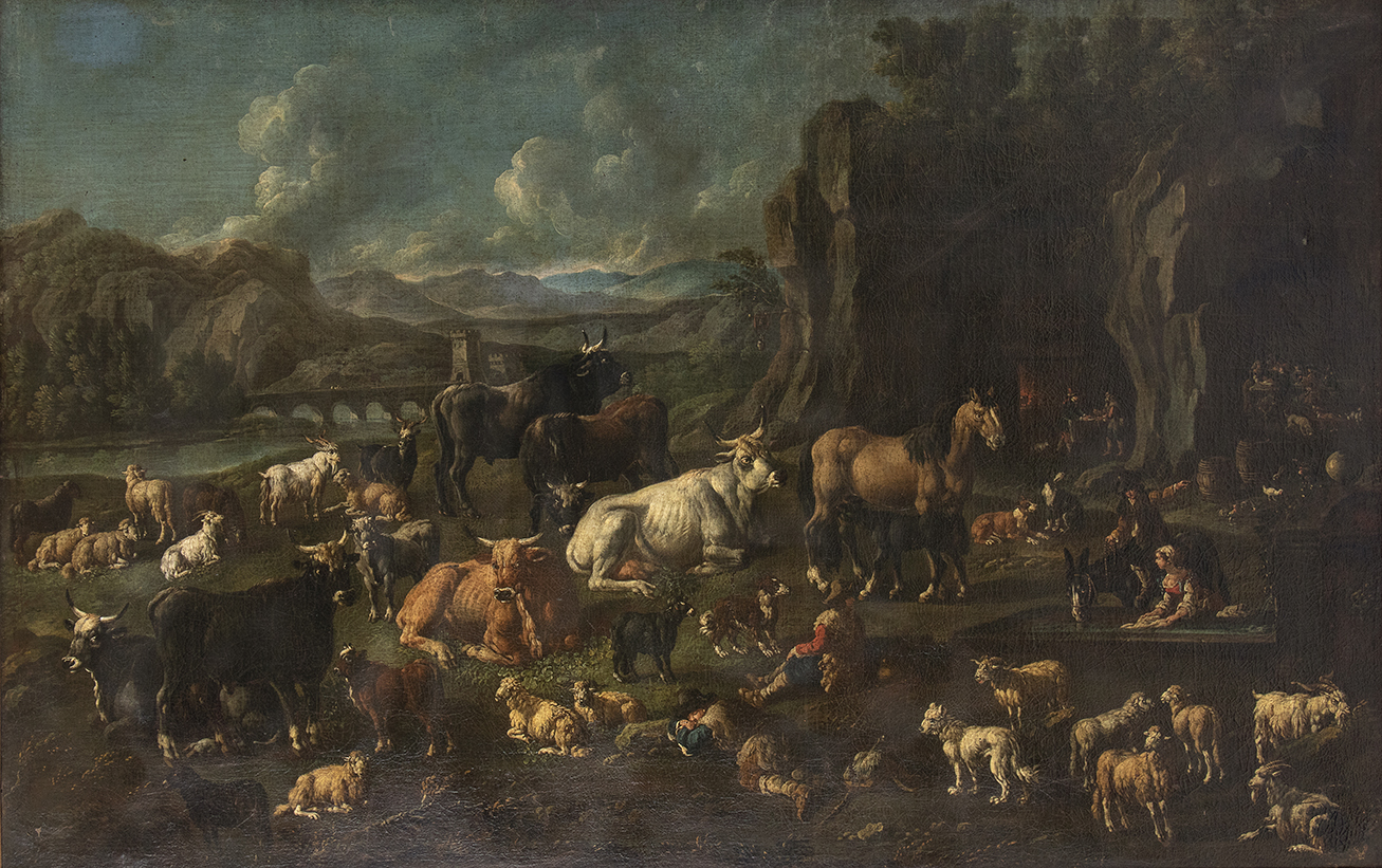Le due grandiose tele en pendant, qui presentate in due lotti singoli consecutivi, offrono un sorprendente campionario delle qualità di Domenico Brandi e possono essere considerate tra i suoi capolavori. Brandi fu apprezzato in particolare come specialista nella rappresentazione di animali, sull’esempio di Rosa da Tivoli, e può essere considerato tra i migliori pittori di genere attivi a Napoli nella prima metà del Settecento. Brulicanti non solo di animali da fattoria, ma anche di figure descritte in varie attività e atteggiamenti, arricchiti da ambientazioni paesaggistiche particolarmente articolate e da presenze architettoniche insolitamente copiose, le due tele meritano di essere segnalate all’interno del corpus di Brandi per la qualità dell’invenzione e la brillantezza della resa pittorica.