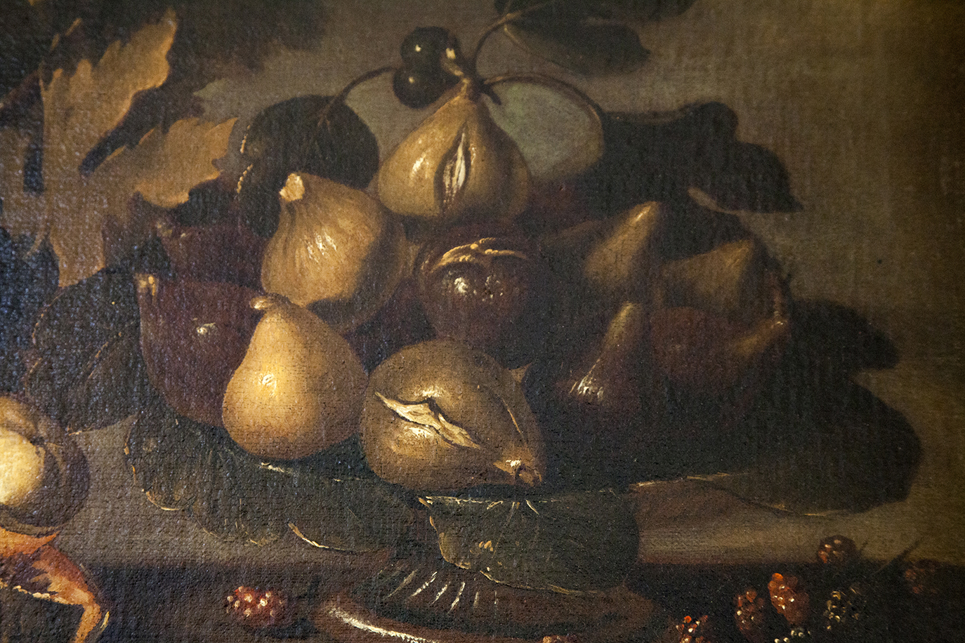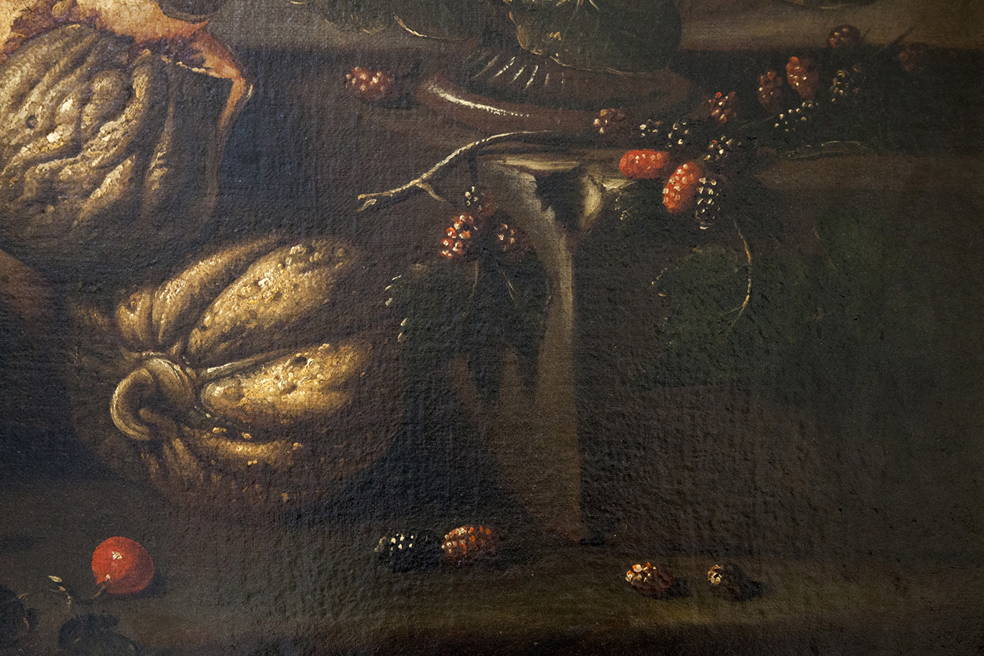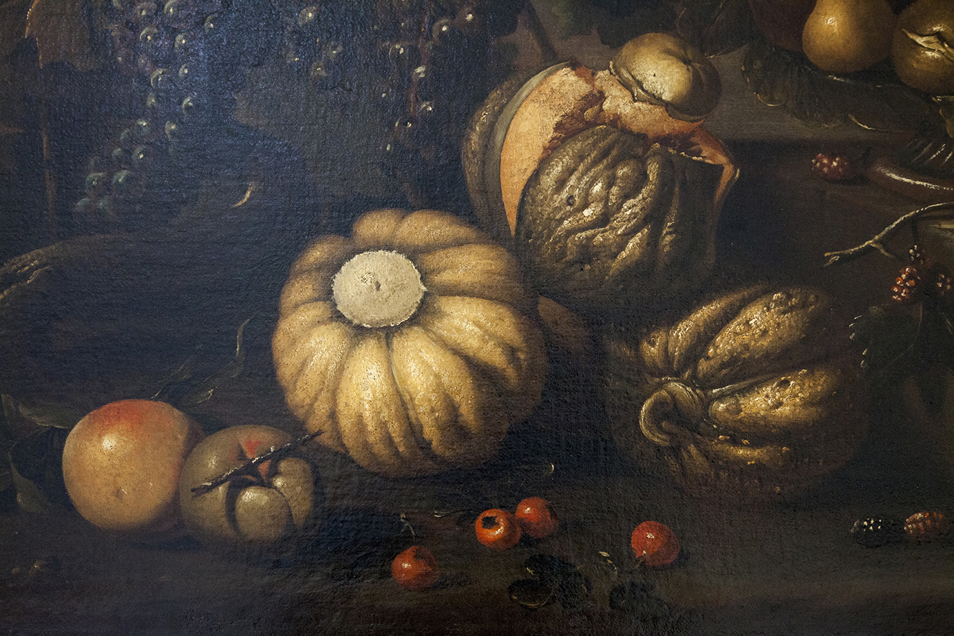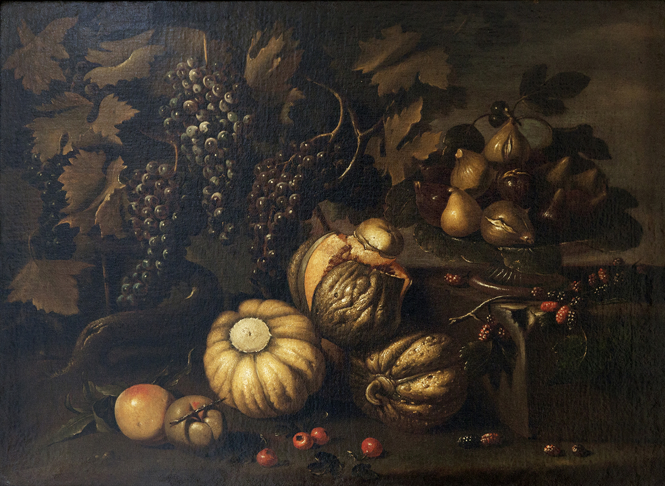 Questa superba natura morta di frutta e ortaggi, scenograficamente ambientati en plein air, fu attribuita da Federico Zeri a Michelangelo Cerquozzi. Accanto alla sua più idiomatica e abbondante produzione di bambocciate e di battaglie (quest’ultima, com’è noto, gli valse il soprannome di Michelangelo delle Battaglie), l’attività come naturamortista, per quanto più esigua, assegna al pittore un ruolo fondamentale negli sviluppi del genere a Roma dopo l’esaurimento della stagione legata alle suggestioni caravaggesche e verso le nuove tendenze più specificamente barocche, che si affermano nei decenni centrali del secolo. Le più celebri incursioni di Cerquozzi in questo genere (che stando alle fonti e agli inventari romani secenteschi non furono comunque sparute) prevedono la presenza di figure (si pensi alle Raccolta di fichi del Museo del Prado, o alla raccolta delle melograne del Museum Boymans Van Beuninigen di Rotterdam: per le quali, infatti, non si può propriamente parlare di nature morte). Sappiamo però per certo che il pittore si cimentò spesso anche nella natura morta pura, di fiori ma soprattutto di frutta. Tra le candidature più autorevoli all’attribuzione a Cerquozzi va annoverato senz’altro, auspice Zeri, l’esemplare che qui si presenta, come testimoniano i bellissimi grappoli di uva nera, i fichi smaglianti sull’alzata e le tre grandi zucche in primo piano, che rimandano a quelle della Raccolta dell’uva già in collezione Gasparrini, Roma, e del Satiro che coglie l’uva, già Colnaghi, Londra.