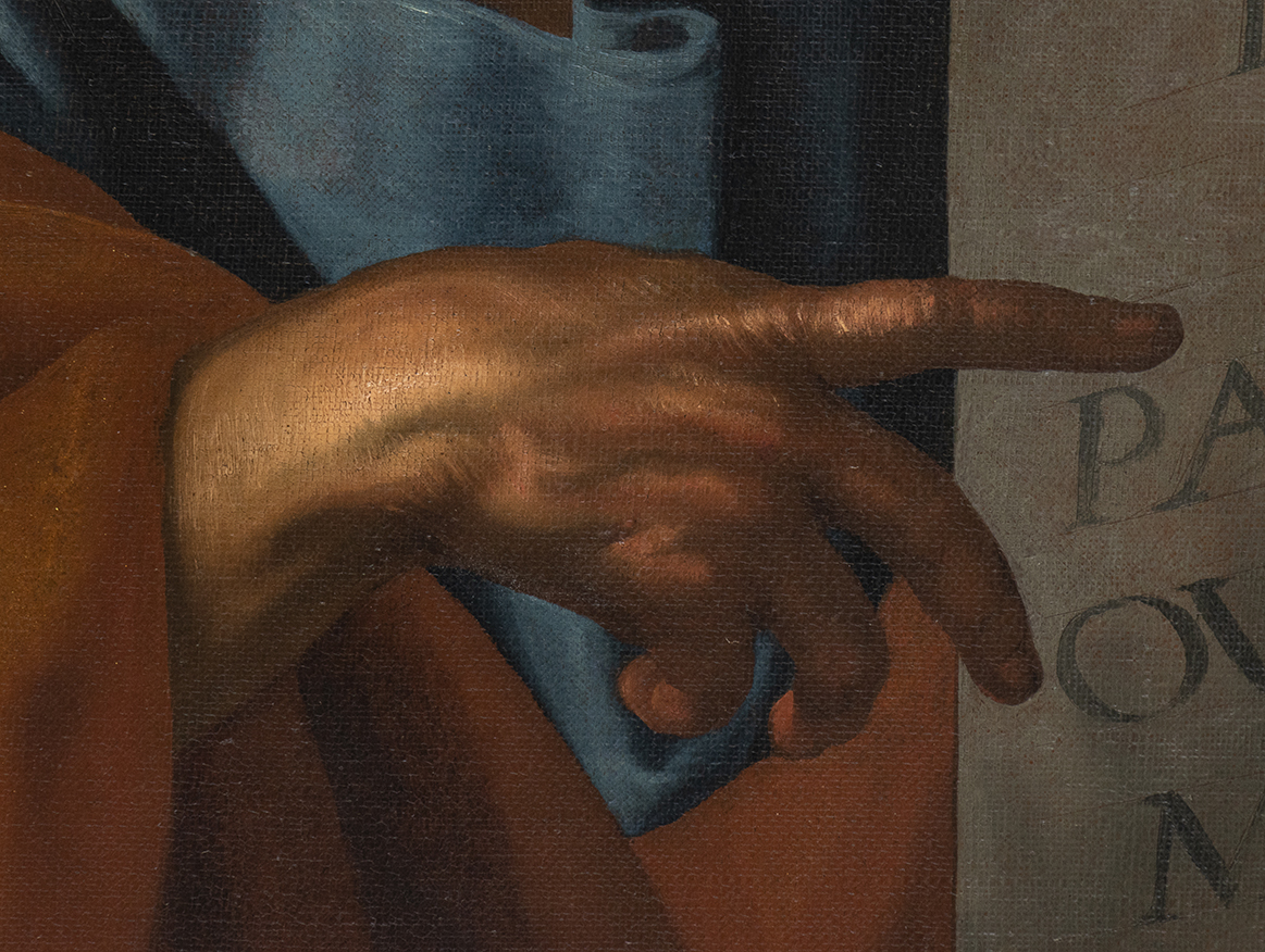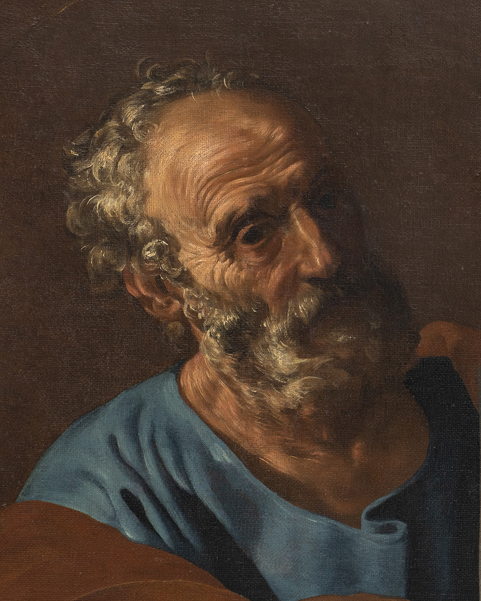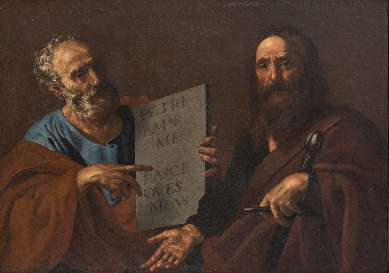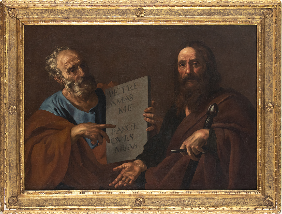 Questa bella tela può essere convincentemente ricondotta al periodo romano di Nicolas Tournier, tra i protagonisti di quella pattuglia di artisti francesi che, tra il secondo e l’inizio del terzo decennio del Seicento, durante il loro soggiorno nell’Urbe aderirono all’idioma caravaggesco. La tela è imperniata sulle monumentali figure a mezzo busto dei due apostoli Pietro e Paolo, che si staccano plasticamente da un fondo neutro. La figura posta a sinistra mostra una pietra, simbolo del suo nome, sulla quale è incisa l’iscrizione: “PETRE / AMAS / ME / PASCE / OVES / MEAS” (Giovanni 21, 17). Al suo fianco, la figura possente di San Paolo può essere agevolmente riconosciuta per il suo principale attributo, la spada del martirio. La presenza dei due santi, patroni di Roma, affiancati in un’unica composizione è piuttosto rara anche nella pittura romana del Seicento. Nicolas Tournier è documentato a Roma dal 1619 al 1627. Sappiamo che nel 1619 viveva con un Gerardo pittore, probabilmente Gérard Douffet, pittore caravaggesco vicino a Valentin, mentre nel 1620 Tournier divideva la sua abitazione con due pittori nordici, fra cui un certo Nicolas, forse da riconoscere in Nicolas Régnier. Nella nostra tela si colgono i principali elementi che caratterizzano la pittura romana di Tournier: Valentin da un lato e Bartolomeo Manfredi dall’altro, ovviamente sulla base di un’originale adesione al naturalismo caravaggesco. Termini di confronto piuttosto stringenti per la figura di San Pietro, sono il vecchio giocatore nei Giocatori di dadi di Louisville, Speed Art Museum, i San Pietro di varie versioni della Negazione di Pietro (Dresda, Gemaldegalerie; Atlanta, High Museum of Art; Madrid, Museo Del Prado), il vecchio soldato del Corpo di guardia della Gemaldegalerie di Dresda. Figure assai affini al nostro San Paolo si ritrovano nel San Paolo scrive le Epistole (Houston, Sarah Campbell Blaffer Foundation) e nel San Paolo del Musée des Augustins di Tolosa.