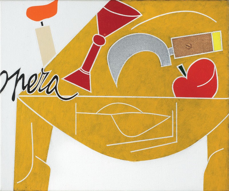 Emilio Tadini Milano 1927 - 2002 Il tavolo giallo, 1974 Olio su tela, cm. 38x46,5 Firma, titolo, data e dedica al verso sulla tela: Emilio Tadini / Il tavolo giallo / 1974 / A Antonio / Emilio.