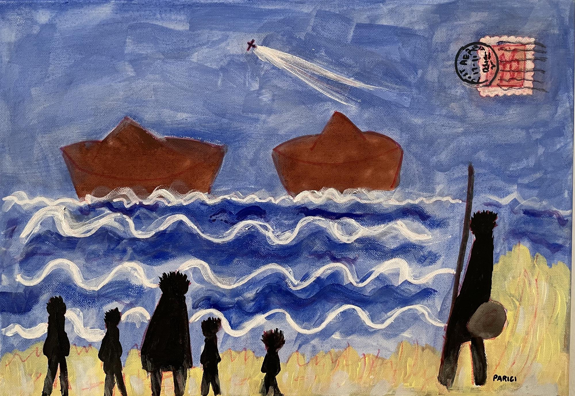Claudio Parigi ...E NOI QUANDO L'ATTRAVERSIAMO IL MEDITERRANEO? acrilico su...