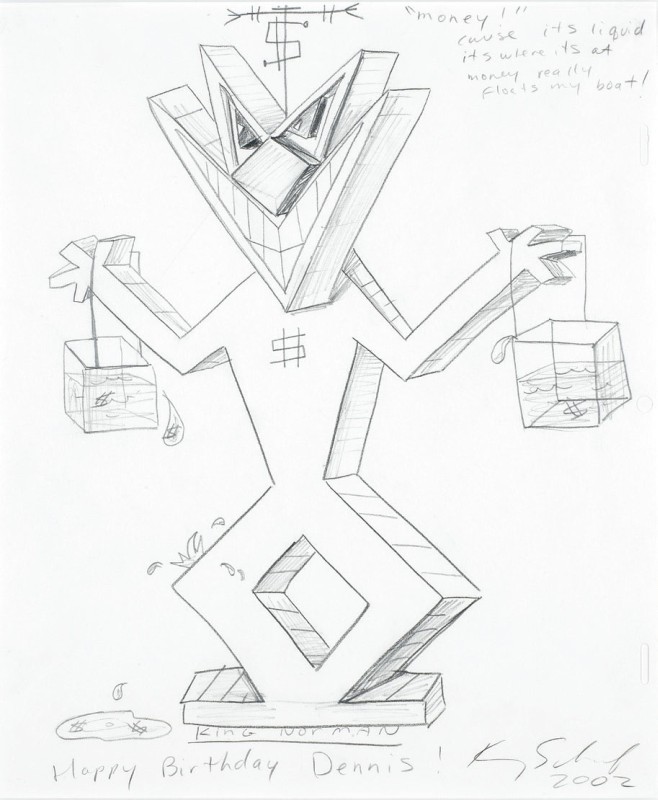 Kenny Scharf Los Angeles 1958 King Norman, 2002 Matita su carta, cm. 31,8x26,6 Firma e data in basso a destra: K. Scharf / 2002, titolo e scritta in basso al centro: King Norman / Happy Birthday Dennis! Storia: Tony Shafrazi Gallery, New York; Collezione privata