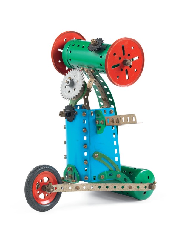 Enrico Baj Milano 1924 - Vergiate (Va) 2003 Meccano, anni Sessanta Scultura in ferro colorato, lamine, ruote e cilindri, cm. 26 h. Esposizioni: Tra scrittura e materia / tra ombra e presenza, Viterbo, Galleria Miralli, maggio 2002; Grandi maestri, piccole sculture, da Depero a Beverly Pepper, a cura di Lara Vinca Masini, Pistoia, Palazzo Sozzifanti, 6 aprile - 30 giugno 2013, cat. pp. 126, 127, illustrata a colori.