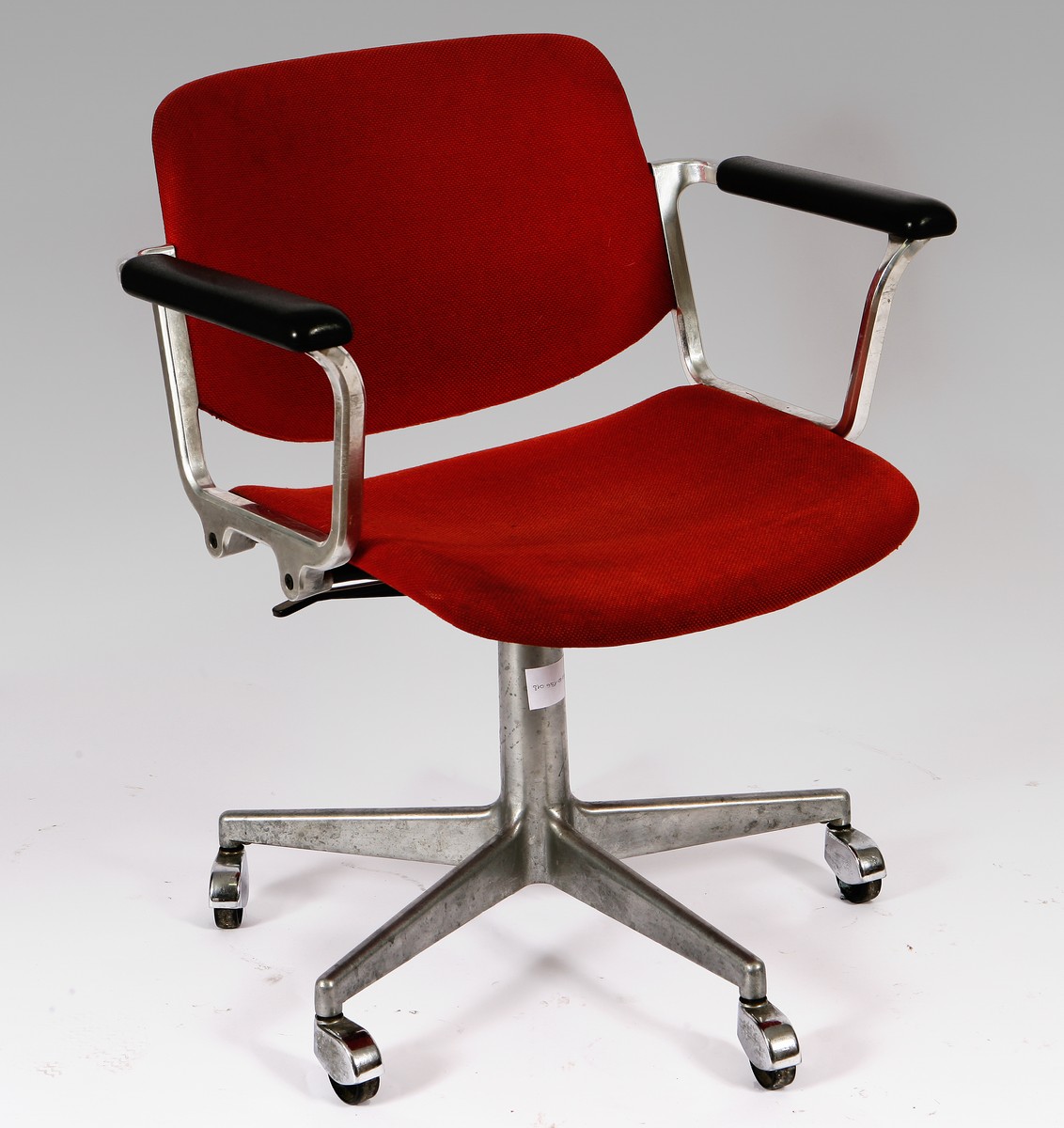 ANONIMO. Poltrona da ufficio. Struttura in alluminio, seduta, schienale e braccioli imbottiti. Office armchair. Aluminum frame, seat, back and armrests padded. Alluminio. Cm 63x77x43. 1960 ca