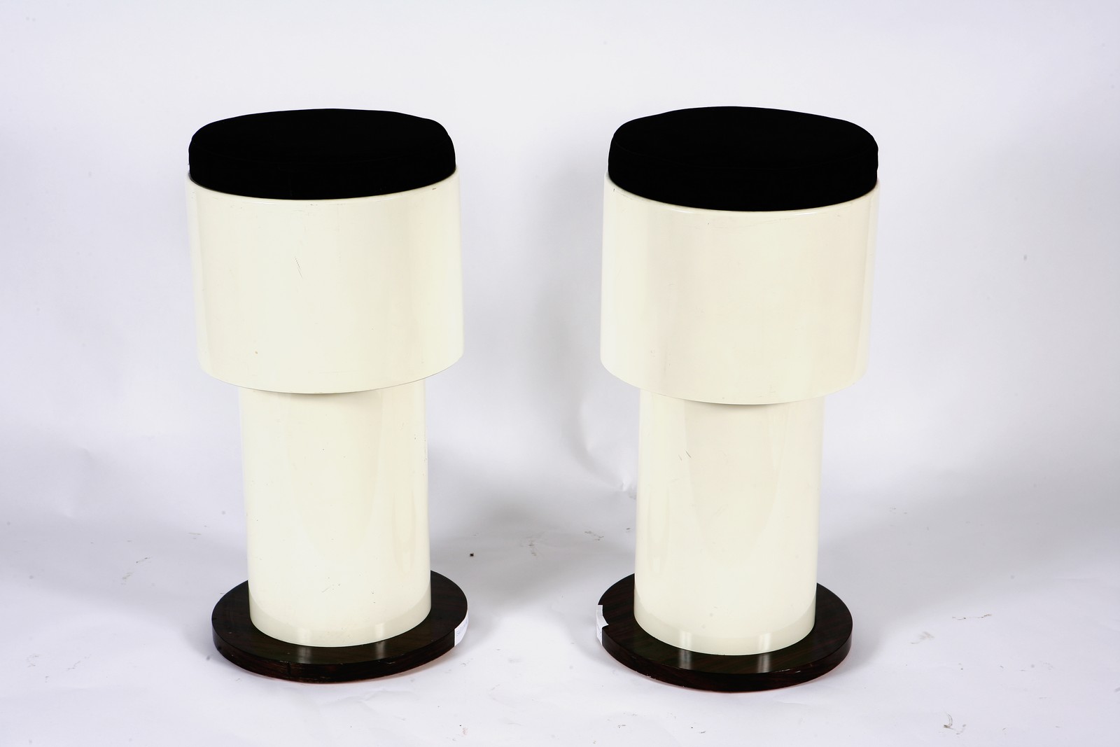PRODUZIONE ITALIANA - ITALIAN WORK. Coppia di sgabelli con seduta imbottita. Struttura in legno laccato. Pair of stools with upholstered seats.Frame in lacquered wood. Legno laccato. Cm 36x70. 1960 ca