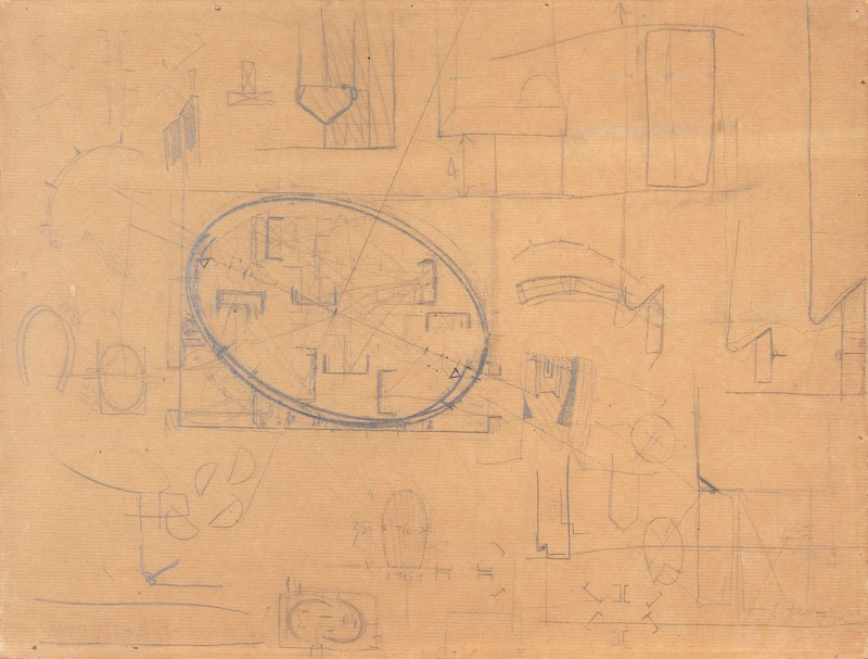 Lucio Fontana Rosario Santa Fè 1899 - Varese 1968 Progetto per la sala alla XXXIII Biennale di Venezia, 1966 Matita su carta da pacchi applicata su tavola, cm. 43,5x57 Firma in basso a destra e al verso: L. Fontana. Opera registrata presso la Fondazione Lucio Fontana, Milano, al n. 2433/1.