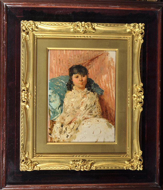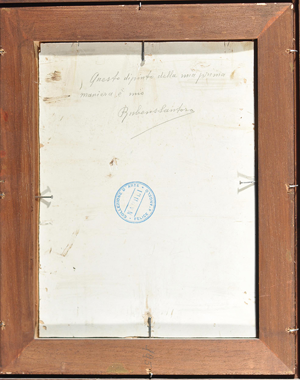 Santoro Rubens (Mongrassano, CS 1859 - Napoli 1942) Figura femminile olio su tela rip. su carta cm. 24x18 firmato iscritto e datato in basso al centro : R. Santoro Roma 78 a tergo timbro Collezione d'arte Felice D'Angelo Napoli