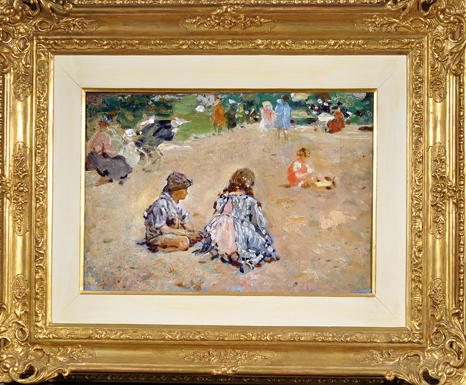 Ragione Raffaele (Napoli 1851 - 1925) Bimbi al Parc Monceau olio su cartone cm 28x40 firmato in basso a destra: R. Ragione Provenienza: Coll. privata, Bologna