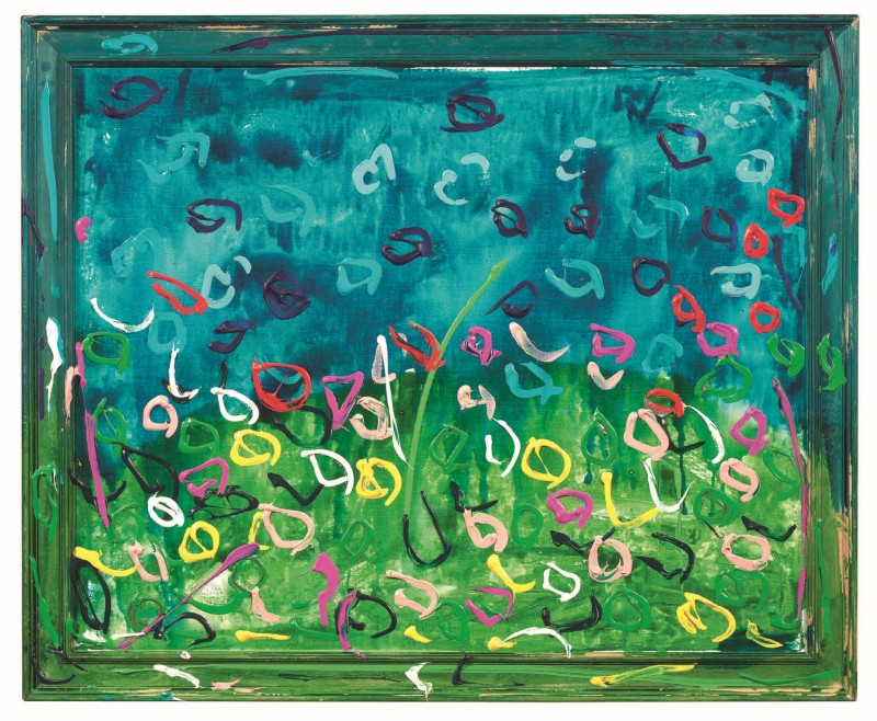 Mario Schifano Homs 1934 - Roma 1998 Senza titolo, 1984-85 Smalto e acrilico su tela, con cornice dipinta, cm. 92,5x112,5 Firma al verso sulla tela: Schifano: etichetta Fondazione M.S. Multistudio / Archivio dell'opera pittorica / di Mario Schifano, con n. 84-85/13. Certificato con foto Fondazione M.S. Multistudio, Archivio dell'opera pittorica di Mario Schifano, Milano, 30 marzo 2011, con n. 84-85/13.