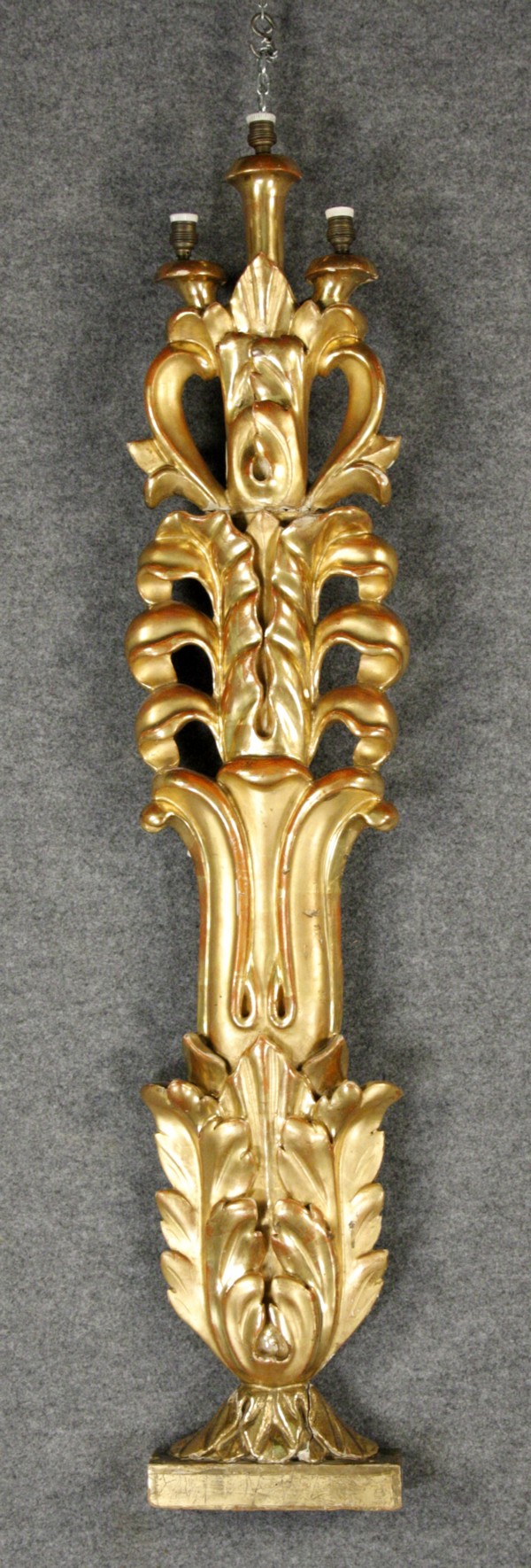 Grande fregio in legno intagliato e dorato a foglia trasformato in applique tre luci a parete. Fine XVIII secolo. Mis. Lung. cm. 25 Alt. cm. 110 ca.
