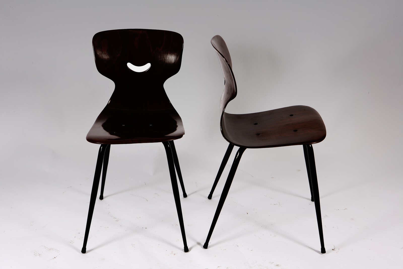 PAGHOLZ. Due poltroncine. Compensato curvato e metallo verniciato. Two armchairs.Curved plywood and painted metal. Compensato e metallo verniciato. Cm 42x76x34. Timbro del costruttore. Stamped.