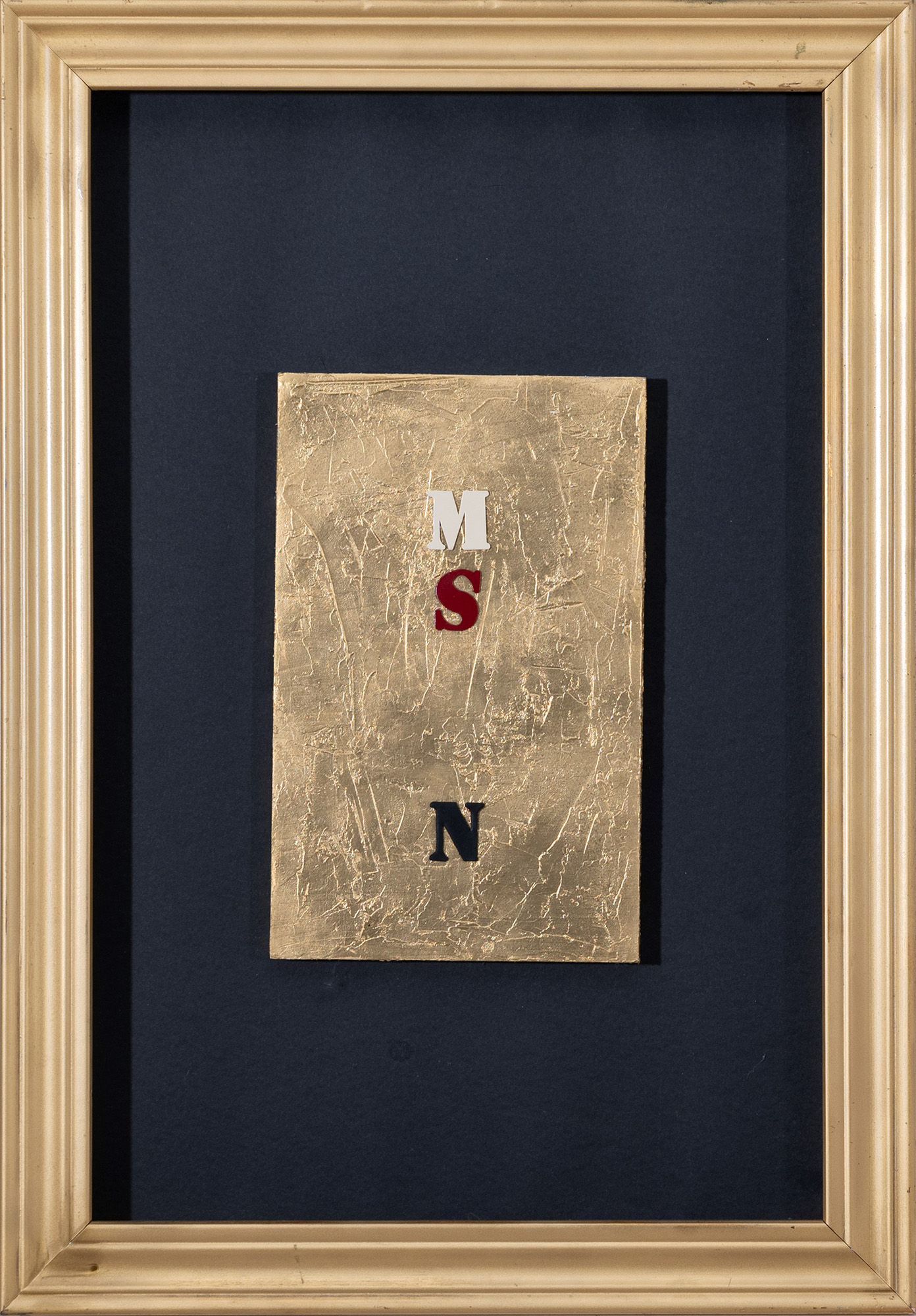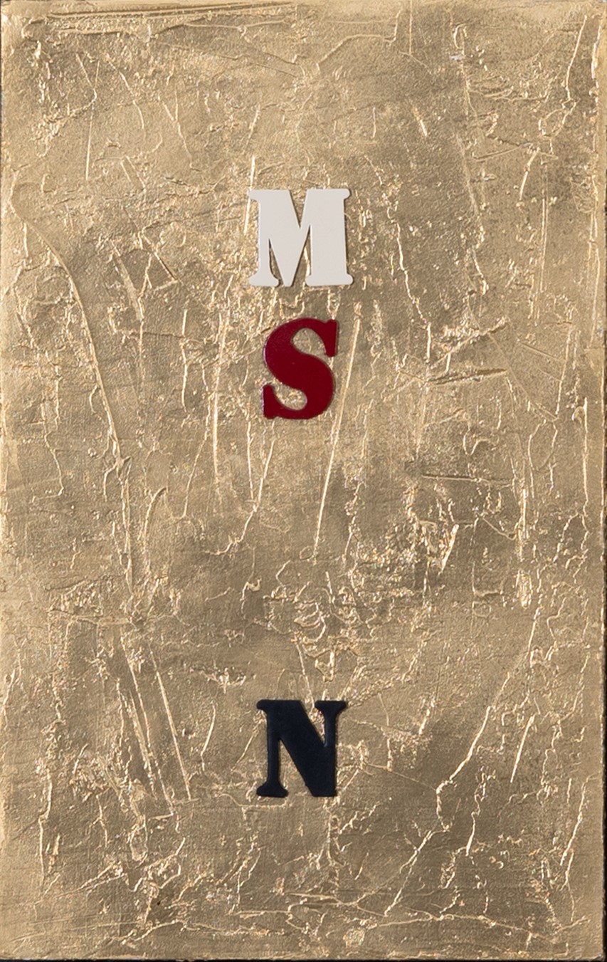 applicazioni di lettere in plastica su foglia d'oro riportata su tavola