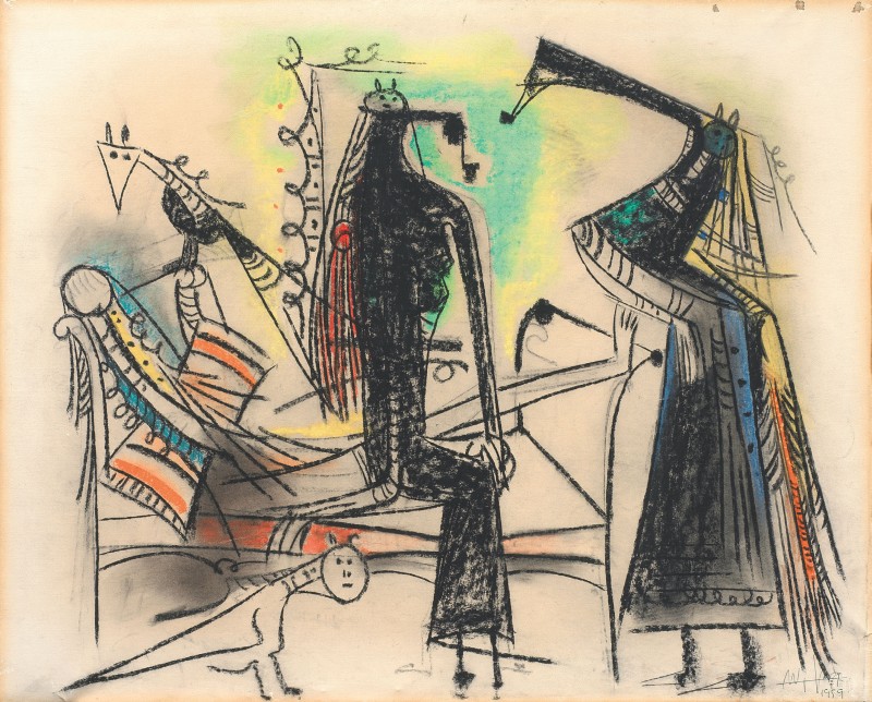 Wifredo Lam Sagua La Grande 1902 - Parigi 1982 Ça va mal, 1959 Pastelli su carta applicata su tela, cm. 58x72 Firma e data in basso a destra: Wi Lam / 59. Al verso sulla tela: due timbri ed etichetta con n. 373/61 Galleria Cadario, Milano. Storia: Galleria Cadario, Milano; Collezione privata Certificato su foto di Lou Laurin Lam, Parigi, 13/04/99, con n. 99-18. Esposizioni: Wifredo Lam. Cuba-Italia. Un percorso, a cura di Luciano Caprile, Milano, Gruppo Credito Valtellinese, Refettorio delle Stelline e Sondrio, Galleria Credito Valtellinese, Palazzo Sertoli e Museo di Storia e Arte Palazzo Sassi De' Lavizzari, 15 novembre 2002 - 25 gennaio 2003, cat. pp. 123, 173, n. 75, illustrato a colori. Mancanze della carta in prossimità del margine superiore.