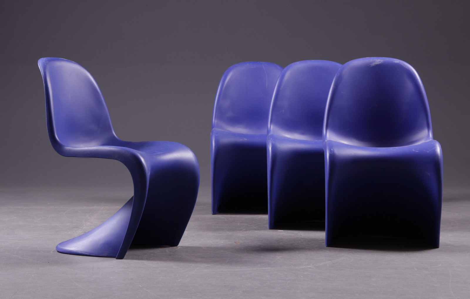 PANTON VERNER (1926 - 1998). "Panton Chair" sedie impilabili in plastica stampata, blu, per Vitra. "Panton Chair", molded plastic stacking chairs, blue, for Vitra. Plastica. Cm 49x81x64. Difetti. Defects. 1967.
