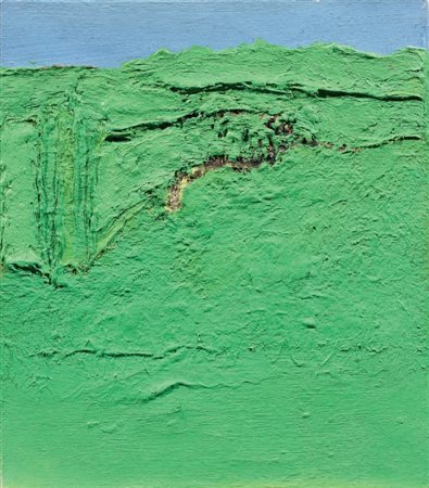 Firma, data e titolo al verso sulla tela: Mattioli / 1977-78 / Paesaggio in / collina; sul telaio: etichetta e timbro Italiana Arte, Busto Arsizio: timbro Galleria d'Arte 32, Milano.