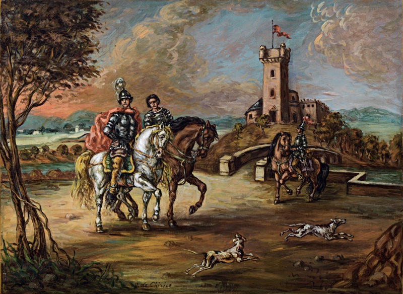 Giorgio de Chirico Volos 1888 - Roma 1978 Cavalieri presso una torre, metà...