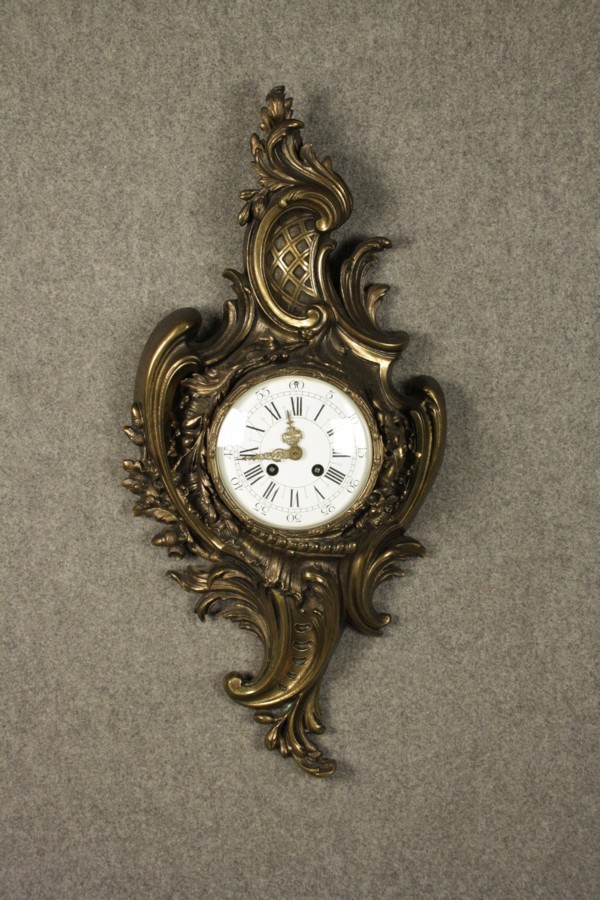 Orologio da parete tipo Cartel in bronzo con quadrante smaltato e numeri romani. Fine XIX secolo. Da revisionare. Mis. Lung. cm. 30 Alt. cm. 65 Prof. cm. 12 ca.