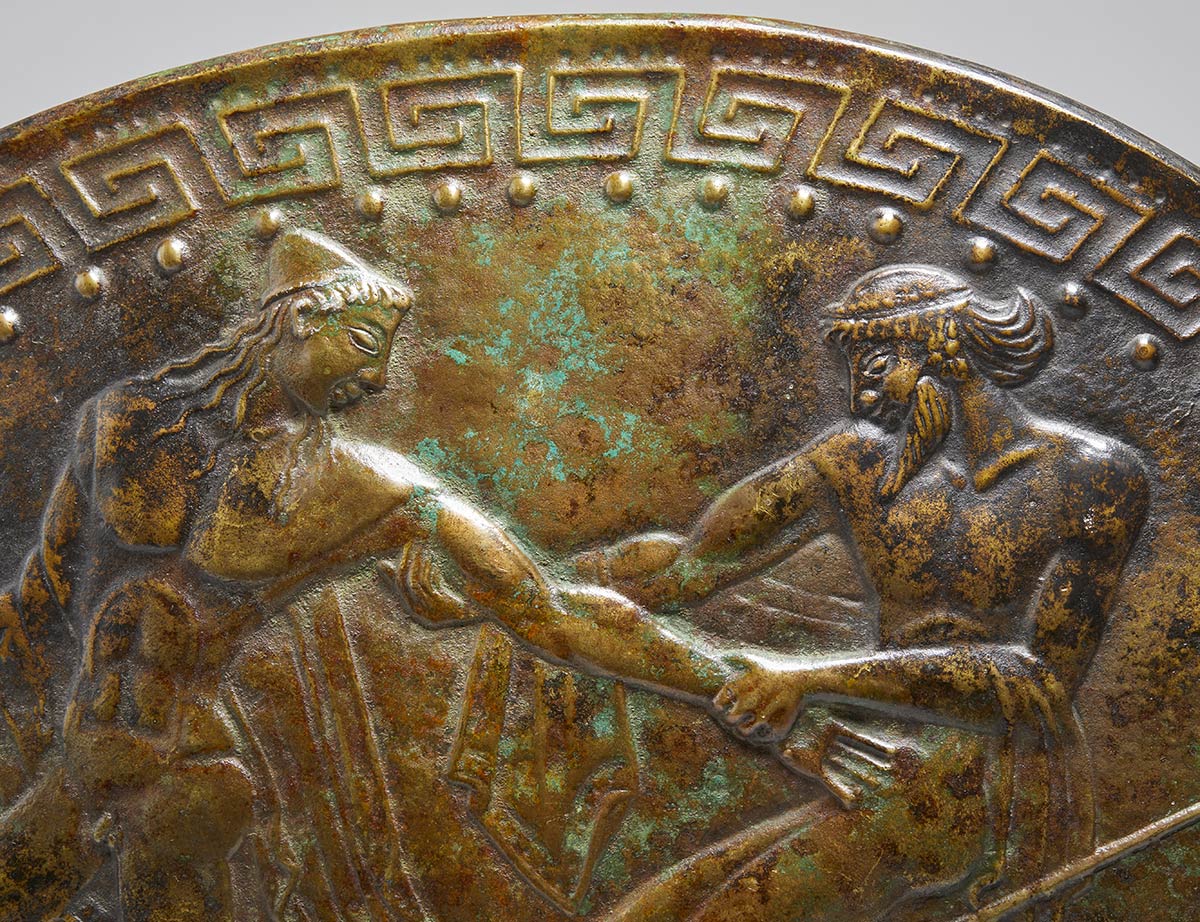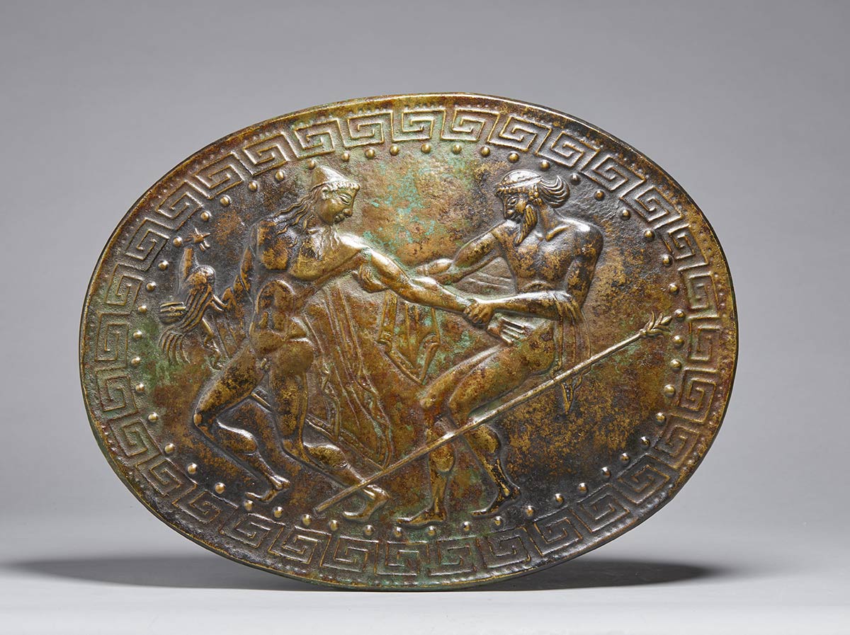 Questo raro e curioso oggetto rappresenta sul fronte una scena di chiara ispirazione classica archeologica. L'episodio di Giove che insegue Ganimede, con un gallo in mano, racconta l'amore omosessuale del dio per un giovane bellissimo, assunto poi all'Olimpico come coppiette degli dei.