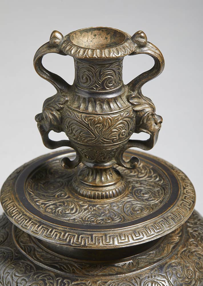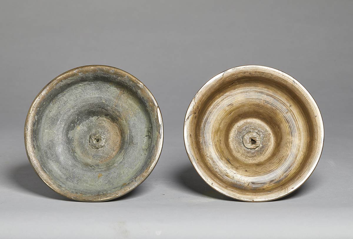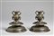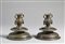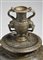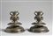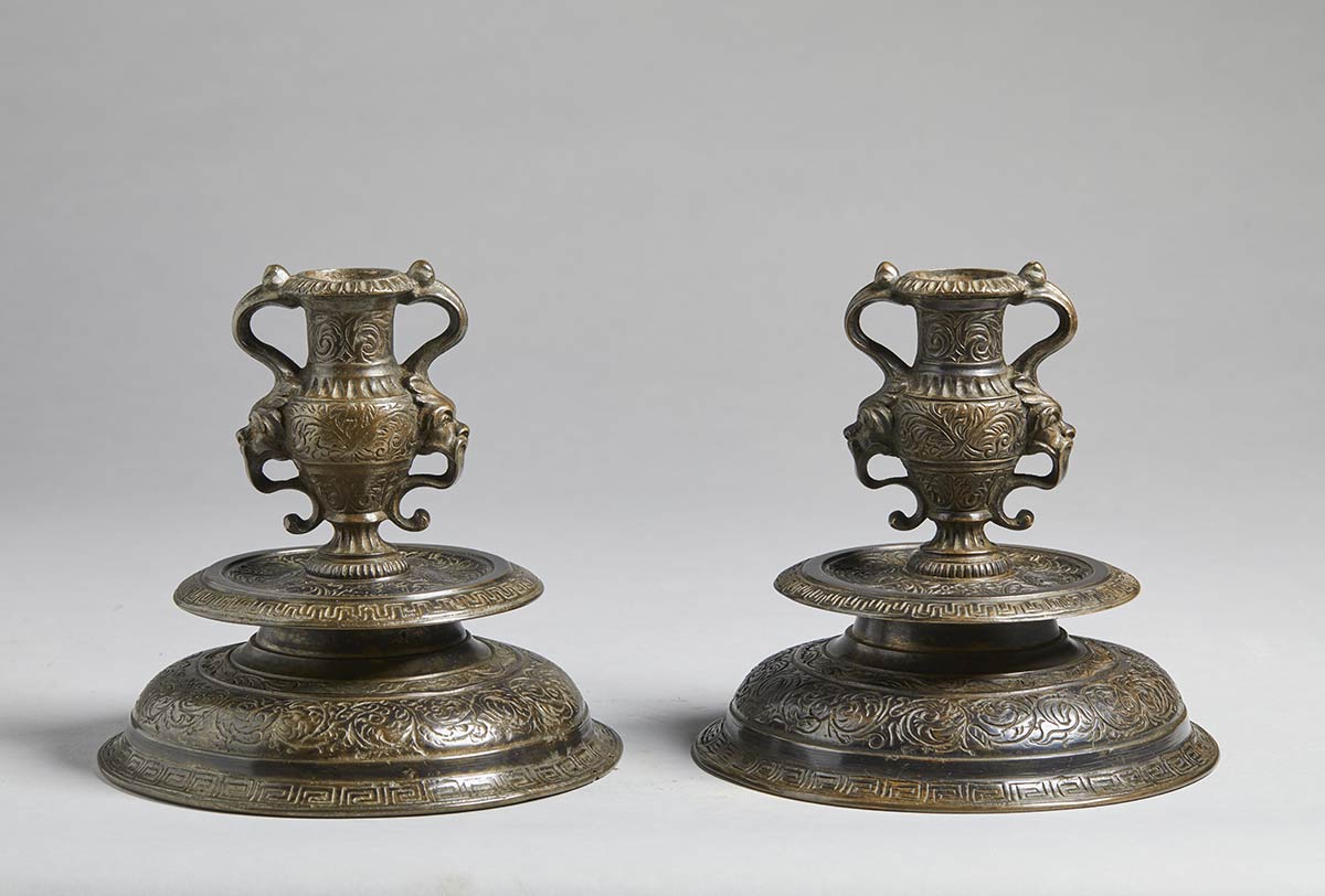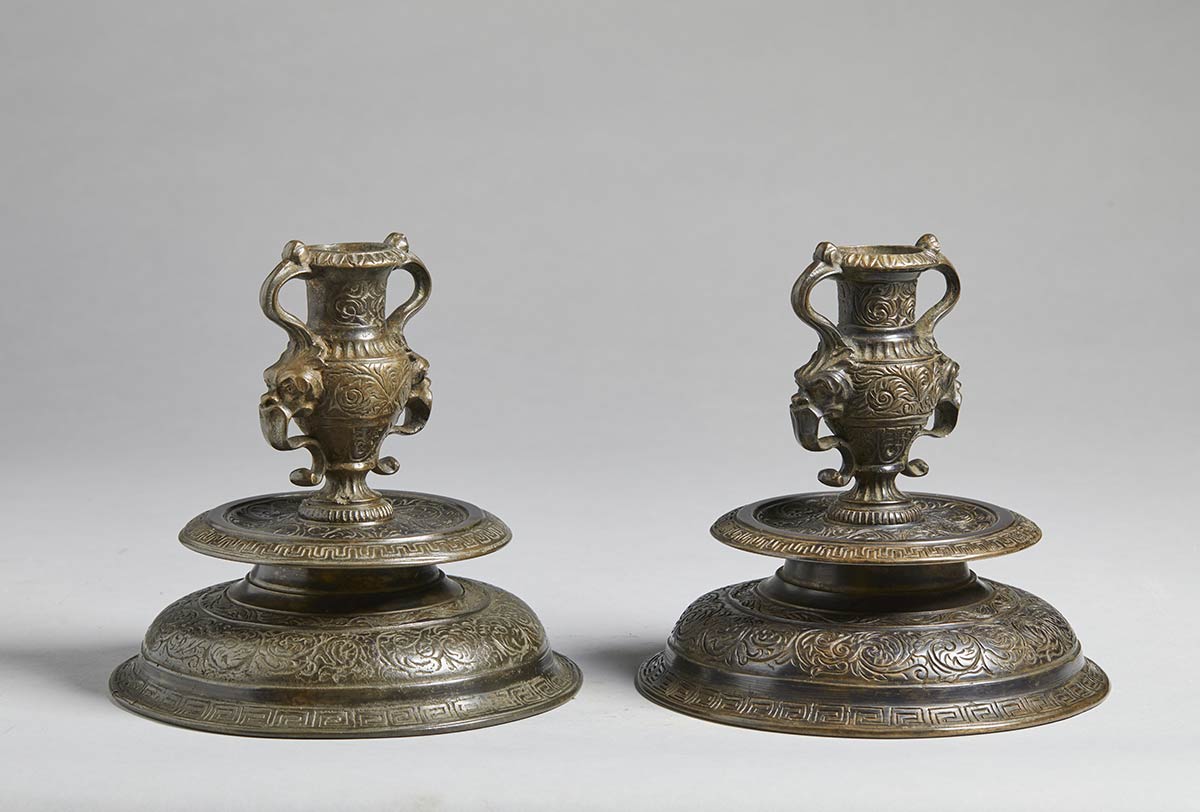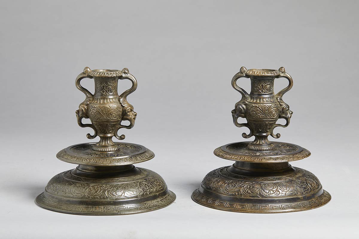 Coppia di candelieri a base circolare decorati interamente con incisioni a motivi fitomorfi e greche. La bobeche è un vaso biansato i cui manici partendo dal bordo superiore si legano al corpo centrale con due teste leonine. Al di sotto della base circolare segni evidenti di tornitura manuale.