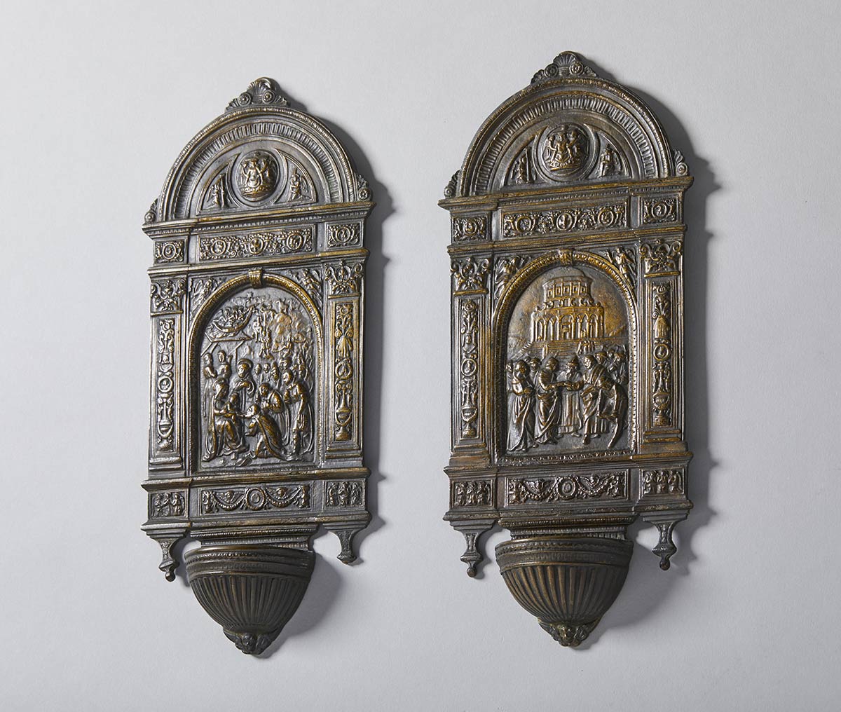 Bella coppia di acquasantiere neo-rinascimentali in cui si dispiegano tutti gli stilemi decorativi del XVI secolo.