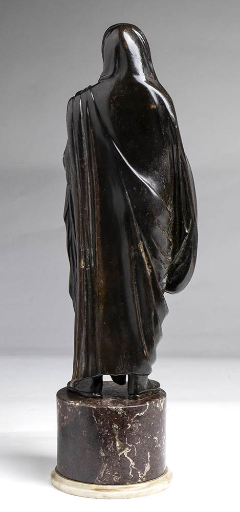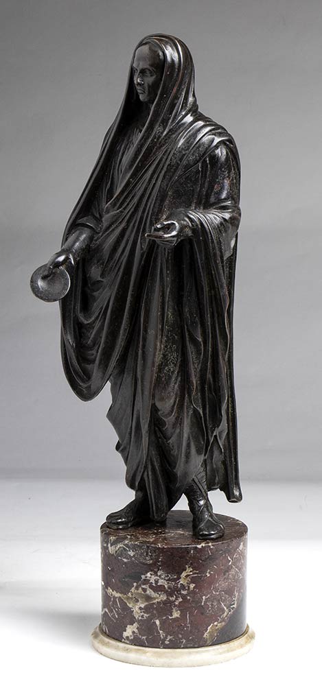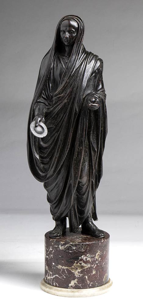 La bella scultura in esame raffigura un "Togato" avvolto dalla tunica splendidamente panneggiata e reggente nella mano destra un piattello.