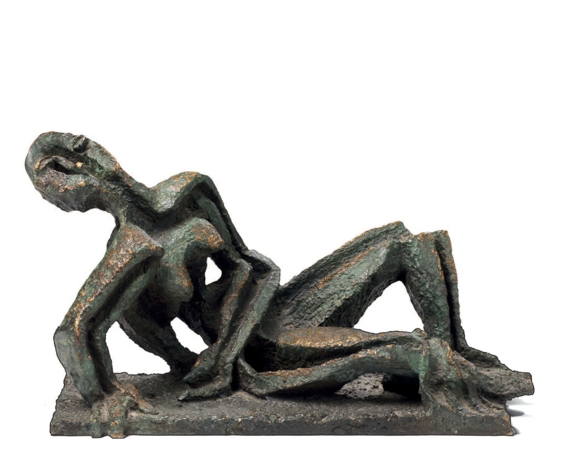 Ossip Zadkine Smolensk 1890 - Parigi 1967 Baigneuse, 1960 ca. Scultura in bronzo a patina verde, es. 1/6, cm. 21x40x18 Tiratura e sigla sulla base: 1/6 OZ. Esposizioni: Grandi maestri, piccole sculture, da Depero a Beverly Pepper, a cura di Lara Vinca Masini, Pistoia, Palazzo Sozzifanti, 6 aprile - 30 giugno 2013, cat. pp. 56, 57, illustrata a colori. Bibliografia di riferimento: S. Lecombre, Ossip Zadkine, L'oeuvre sculpté, Parigi, 1994, p. 581, n. 518 (dimensioni e posizione leggermente differenti).