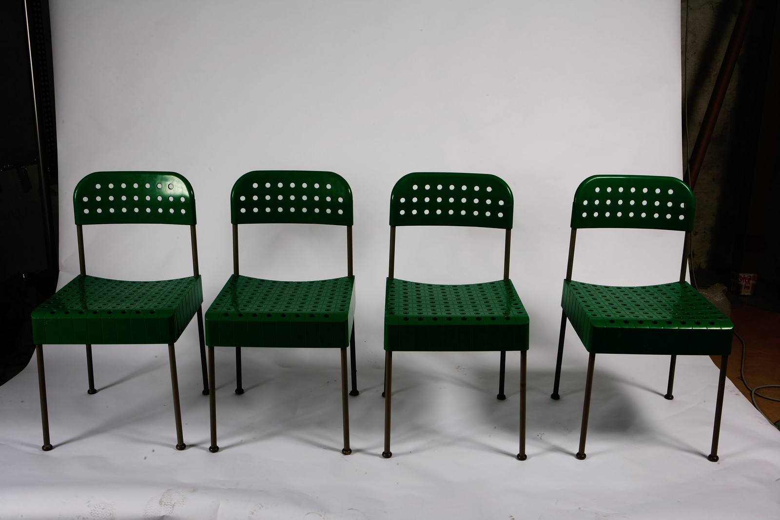 MARI ENZO. Quattro sedie Box per Anonima Castelli. Struttura in acciaio, seduta in propilene. Four Box chairs for Anonima Castelli. Steel frame with polypropylene seat. Acciaio. Cm 43x80x43. Marchiate sotto la seduta. Marked under the seat. 1976.